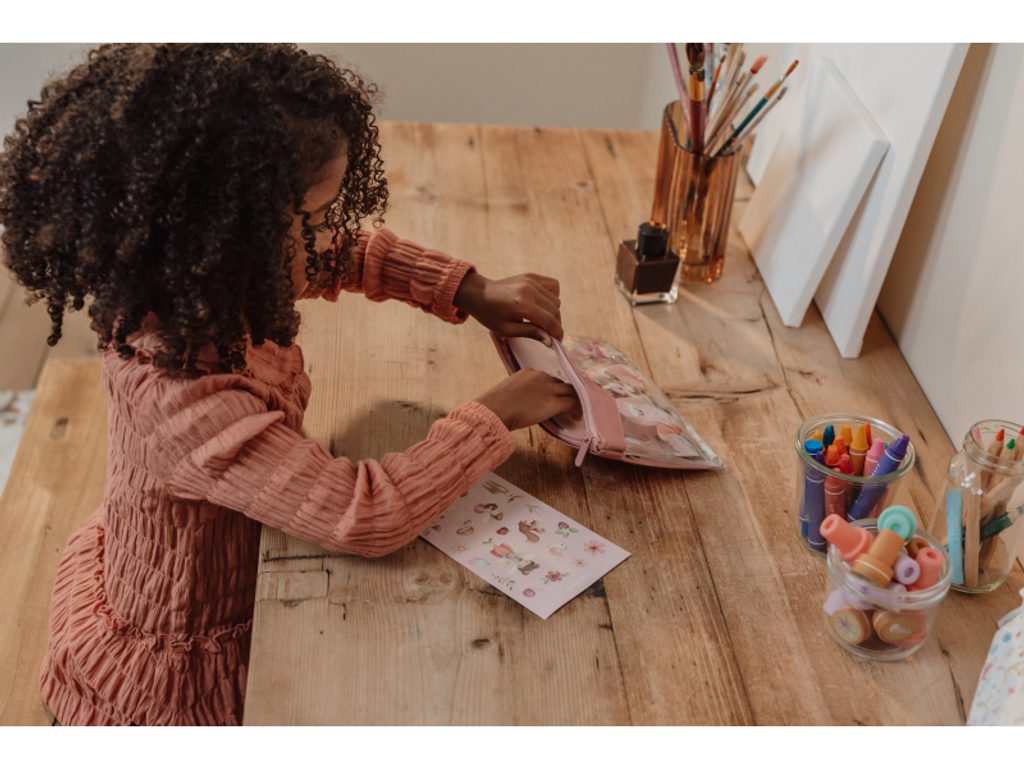 Sada výtvarných potřeb s krásným motivem zahrady v lese obsahuje vše potřebné pro kreativní zábavu. Součástí sady je průhledné pouzdro na zip, sešit, samolepky, pravítko, guma, ořezávátko a šablony. Tento set je součástí designové kolekce hraček a doplňků Little Dutch Fairy Garden, inspirované kouzelným životem na zahradě.