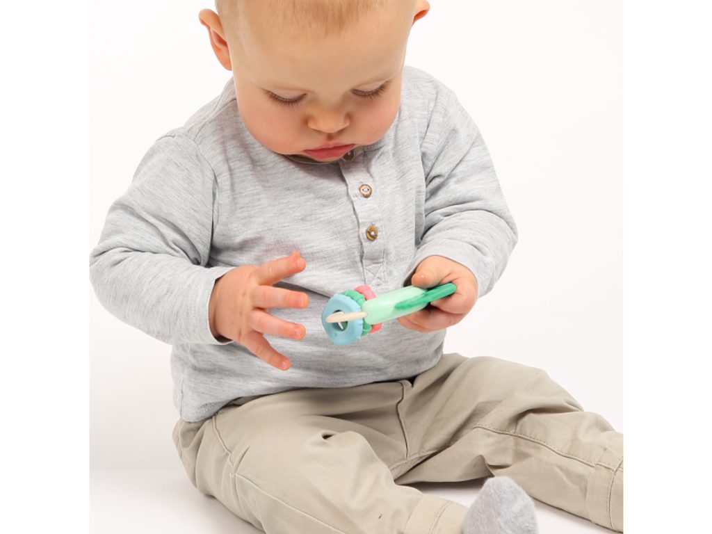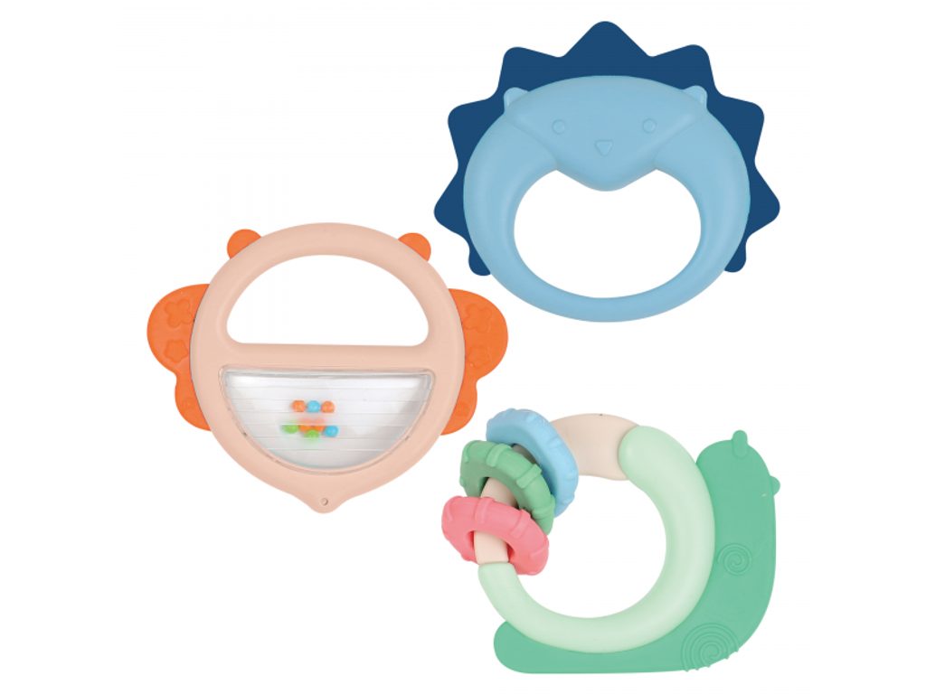 Chrastítka v krásných pastelových barvách ve tvaru zvířátek jsou lehká do ruky a mají tvar pro snadné uchopení. Každé chrastítko má měkkou, pružnou část sloužící jako kousátko pro masírování dásní při prořezávání prvních zoubků. Rozměry: ježek 9,5 x 8,3 x 2 cm, šnek 9 x 7 x 3 cm, motýl 10 x 8 x 2,5 cm Složení: ABS, TP, TPR Vhodné pro děti od 3 měsíců.