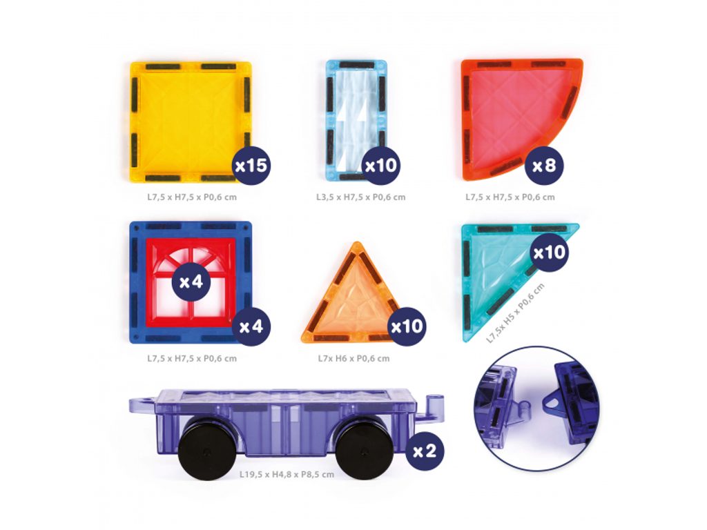 Objevte svět plný pohybu a fantazie s magnetickou stavebnicí Ludi! Praktický plastový box s držadlem ukrývá 63 magnetických dílků, mezi nimiž jsou i 2 podvozky s kolečky, díky kterým mohou děti stavět vlastní auta, náklaďáky nebo třeba pohyblivé stavební stroje. Děti mohou kombinovat různé části a vytvářet nekonečné množství vozidel a stavebních struktur. Každý dílek má integrované magnety po stranách, takže není potřeba žádné klipy ani složité zámky Dílky k sobě přilnou okamžitě, což umožňuje i menším dětem samostatně stavět vlastní výtvory Rozmanité barvy a tvary pro neomezené možnosti Podporuje logické myšlení díky zkoumání magnetických spojů Rozvíjí jemnou motoriku při manipulaci s jednotlivými dílky Podněcuje kreativitu prostřednictvím nekonečného množství kombinací a konstrukcí Perfektní dárek pro malé stavitele a tvořivé duše Všechny díly lze po skončení hry jednoduše uložit do průhledného boxu s držadlem, ideálního na cesty nebo pro přehledné uskladnění doma. Materiál: průhledný ABS plast s magnetickými spoji Vhodné pro děti od 3 let.