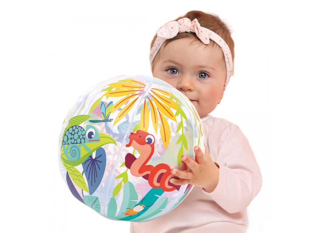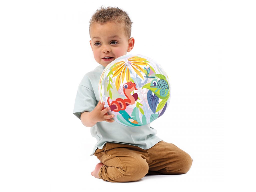 Nafukovací míč Jungle Ball je navržený speciálně pro nejmenší – pomáhá dětem objevovat svět pohybu, hmatu i zraku. Díky tropickému motivu a veselým barvám přitahuje pozornost a probouzí přirozenou zvídavost dítěte. Děti si s míčem mohou házet, kutálet ho, odrážet i sledovat jeho pohyb. Hraní s míčem stimuluje hrubou motoriku, reflexy i představivost. Míč má ideální průměr 20 cm – snadno ho uchopí i malé dětské ručky Měkce nafouknutý a příjemný na dotek – bezpečný při hře doma i venku Průhledné detaily přidávají vizuální zajímavost a podporují rozvoj zraku a koordinace Rozměry: Ø 20 cm Složení: 100 % PVC Vhodné pro děti od 6 měsíců.