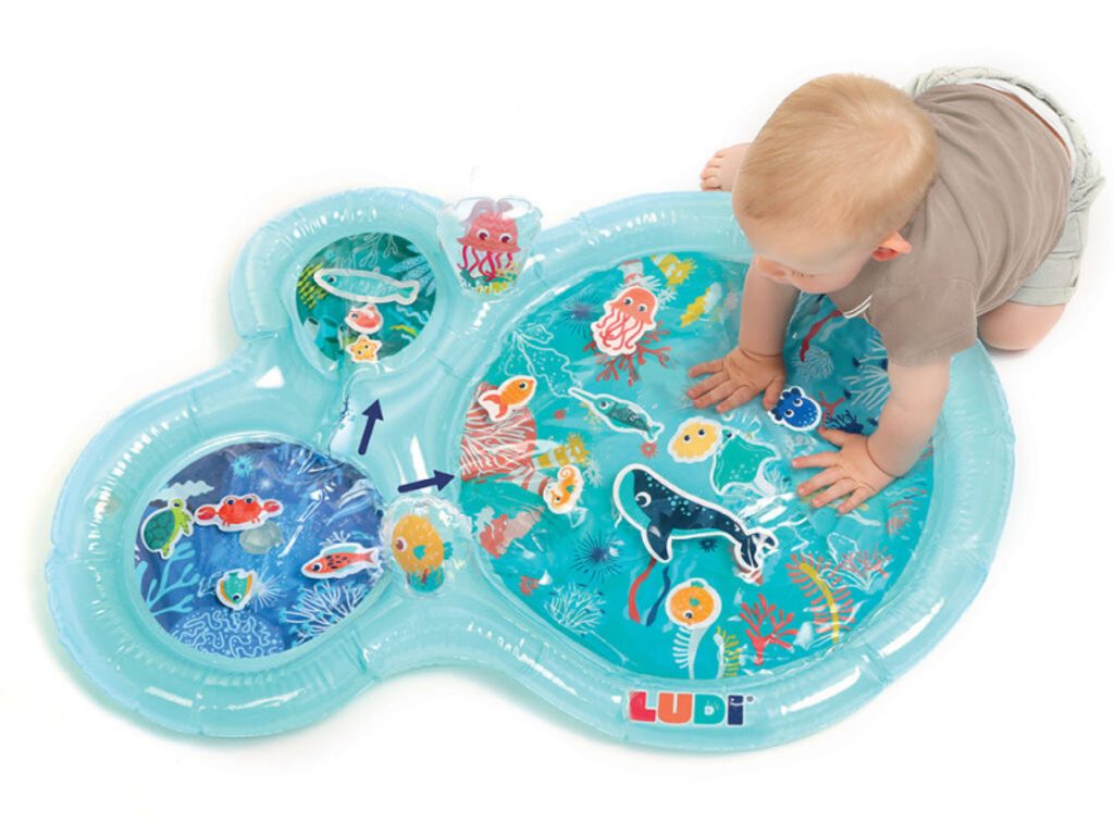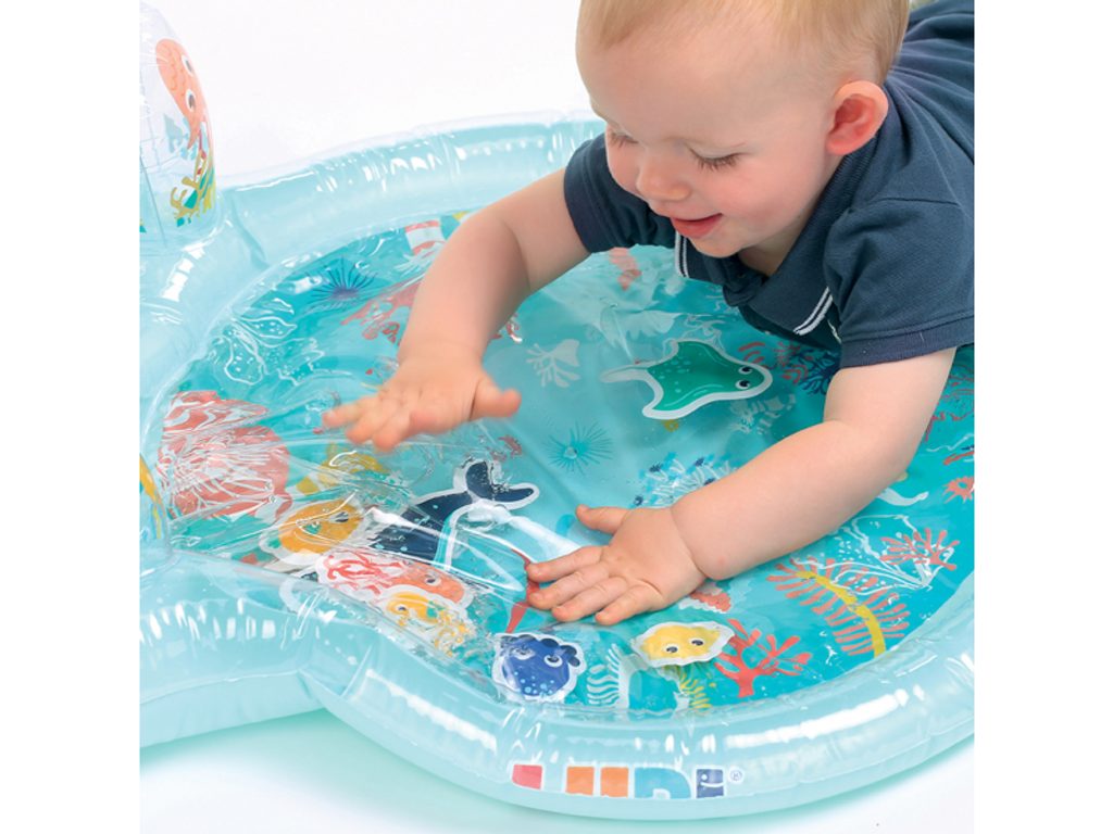 Interaktivní podložka na hraní naplněná vodou připomíná skutečný podmořský svět s vodními živočichy. Figurky mořských tvorů se uvnitř ve vodě začnou pohybovat, kdykoli dítě na podložku sáhne rukou. Jednotlivé části podložky jsou propojené, takže když se dítě o podložku opře, voda proudí mezi jednotlivými částmi. Na nafukovacích okrajích jsou umístěna dvě nafukovací madla, která při zmáčknutí pískají a cinkají. Podložka je ideální pro hru na bříšku, která je důležitá pro správný vývoj dítěte. Hraní na podložce působí na všechny dětské smysly, učí dítě příčině a následku a pomáhá rozvíjet jeho motorické dovednosti. Použití podložky je velmi jednoduché, stačí ji nafouknout a naplnit vodou. Když hračku nepoužíváte, snadno ji opět vyfouknete a vodu vylejete. Rozměr podložky: 94 x 20 x 63 cm Vhodné pro děti od 10 měsíců.