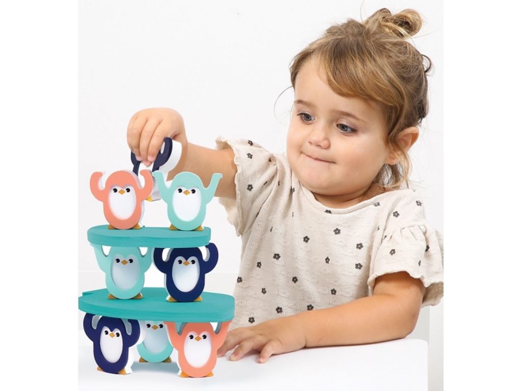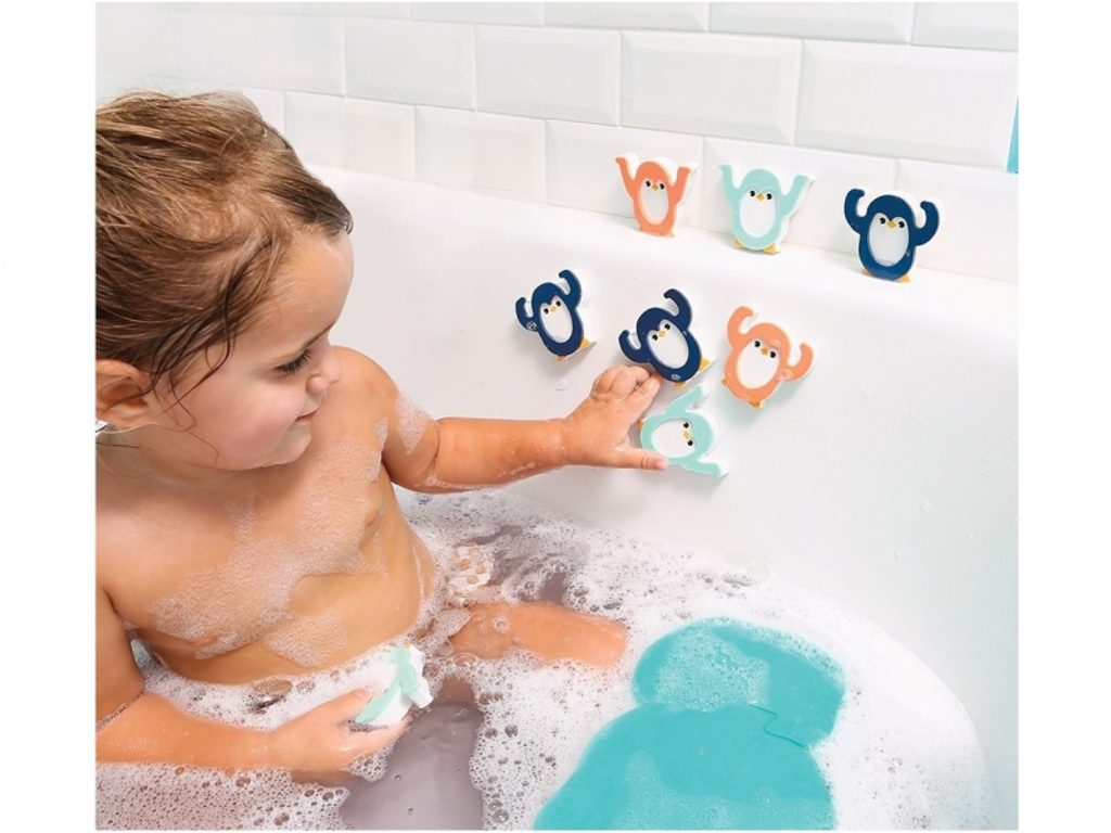 Zábavnou sadu hraček do vody tvoří dvě plovoucí plošiny a 8 roztomilých tučňáků, kteří na plošinách balancují. Tučňáky je možné stavět různými způsoby na sebe a vytvářet z nich pyramidy. Po namočení tučňáci drží přilepení na vaně. Nebo je postavte do řady za sebou a nechte je padat jako domino. Hračka je vhodná nejen pro hraní ve vodě, ale i na na stole či na zemi. Hračka pomáhá rozvíjet jemnou motoriku dítěte i koordinaci rukou a očí. Složení: EVA Vhodné pro děti od 12 měsíců.