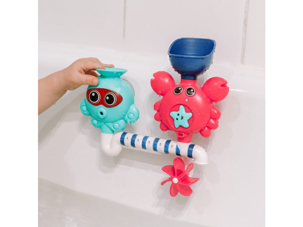 Veselá a zábavná hračka do koupele bude bavit vaše dítě i vás! Pozorujte spolu, co se stane, když do trychtýřů nalijete vodu a ta začne stříkat různými otvory v potrubí a zároveň roztáčet vodní mlýnek! Dítě se během hry s vodou učí rozumět příčině a následku, rozvíjet své pozorovací schopnosti i svou obratnost. Hračka se snadno připevní na vanu či dlaždice s pomocí přísavek. Rozměry: 21,5 x 22,5 x 6 cm Složení: ABS Vhodné pro děti od 10 měsíců.
