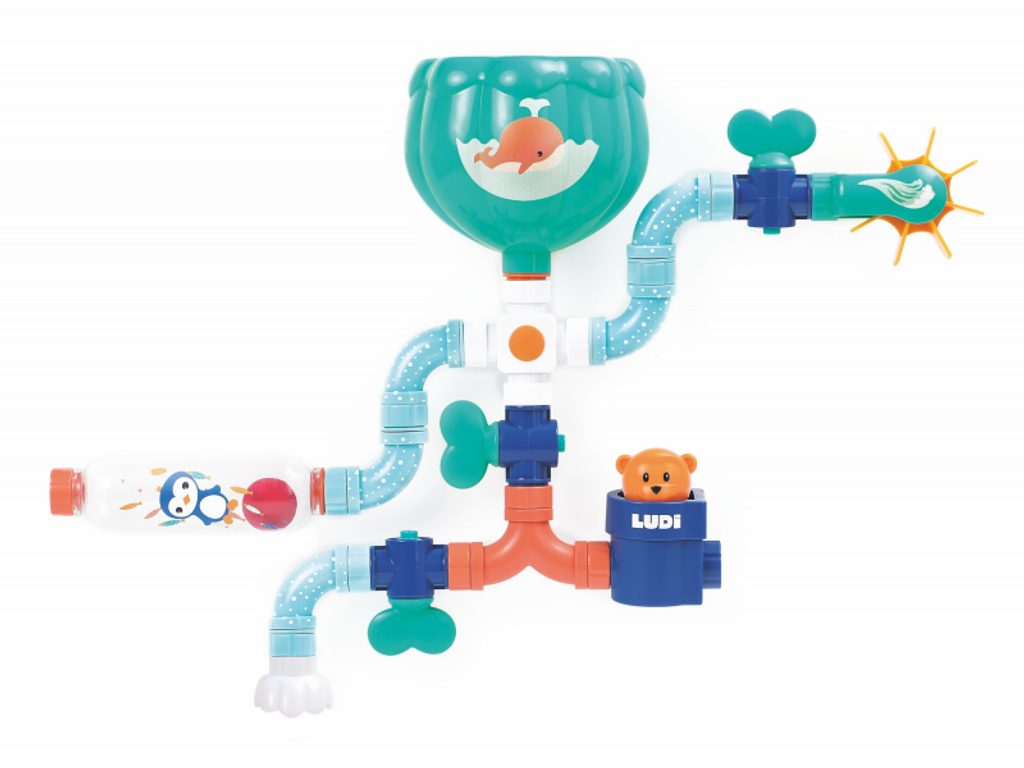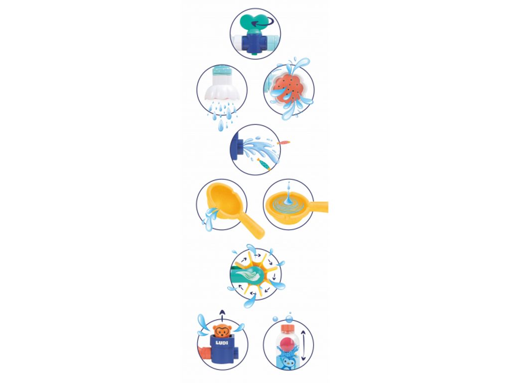 S vodním mlýnkem do koupele nebude při koupání nikdy nuda! Velký vodní okruh s kohoutky, nádrží, sprchou a vodním mlýnkem nabízí mnoho variant sestavení pro zkoumání účinků vody. Když dítě nalije vodu do nádrže a otevře kohoutky, aktivuje se celý okruh! Dítě se bude bavit sledováním, jak v zásobníku vody stoupající míček indikuje hladinu vody a na druhé straně proud tekoucí vody roztáčí mlýnek. Zavíráním jednotlivých kohoutků se proud vody zastaví a dítě se tak během hry učí rozumět příčině a následku, rozvíjet své pozorovací schopnosti i svou obratnost. Hračka se snadno připevní na vanu či dlaždice s pomocí přísavek. Obsah balení: nádrž s přísavkami, konektor, 3 vodovodní kohoutky, 6 trubek, dvojitá trubka, průhledný zásobník s míčkem, vodní mlýnek, vodní sprcha, medvídek, naběračka Vhodné pro děti od 18 měsíců.