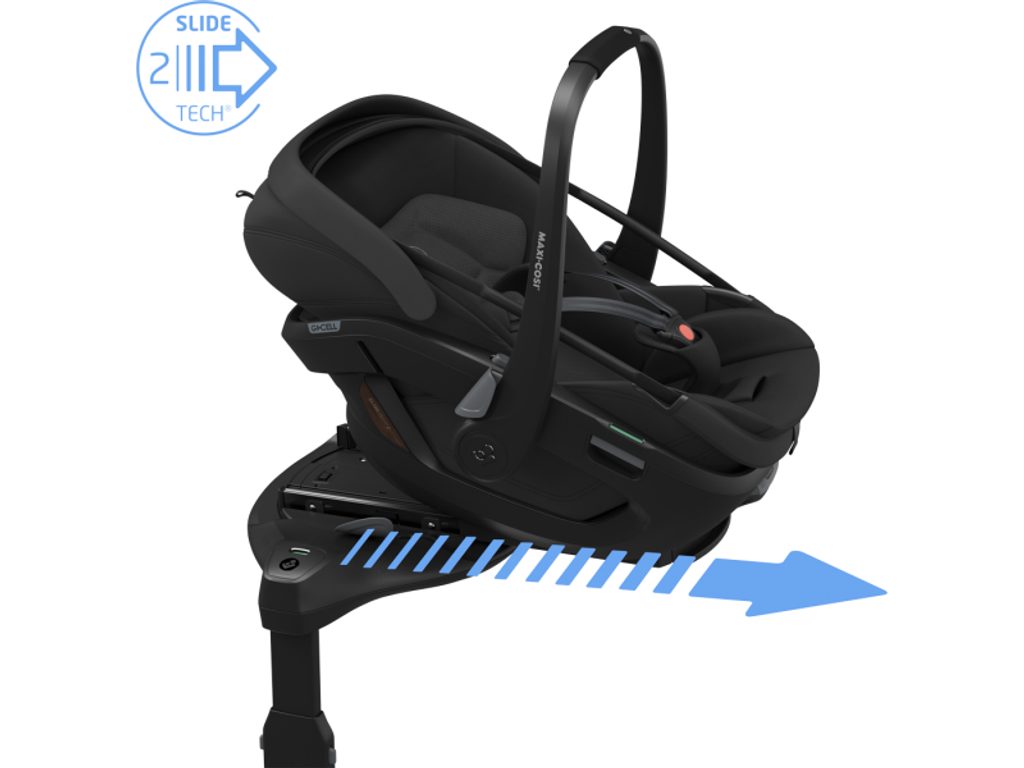 - Základna nabízí 360° otáčení a technologii SlideTech®2, díky které sedačku vysunete až o 27 cm směrem k sobě – ideální i do menších aut.