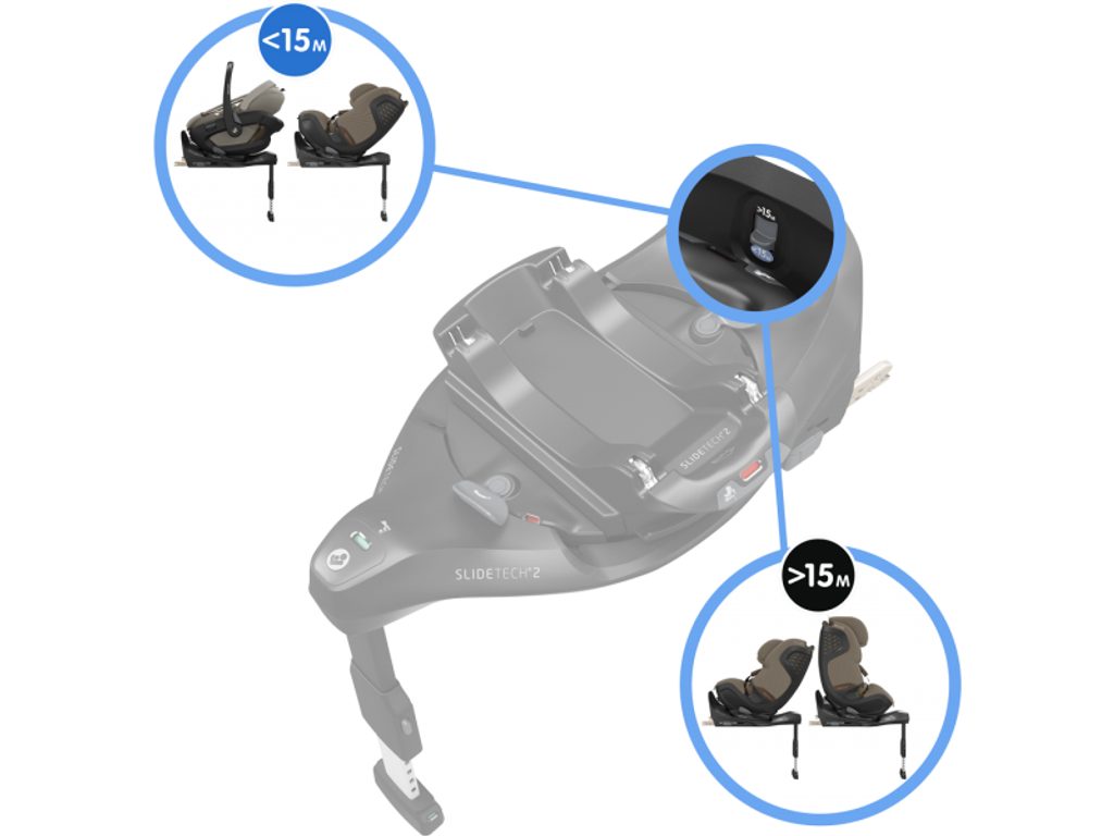 Základna umožňuje, aby dítě cestovalo v autosedačce v protisměru pro lepší ochranu hlavy a krku od narození do 15 měsíců, poté lze autosedačku od 15 měsíců / 76 cm umístit po směru jízdy až do cca 4 let.