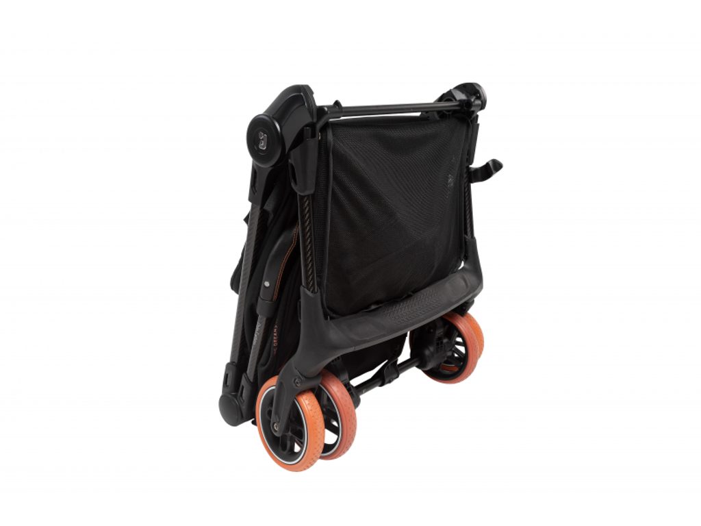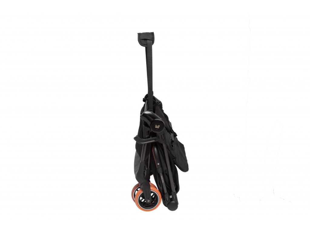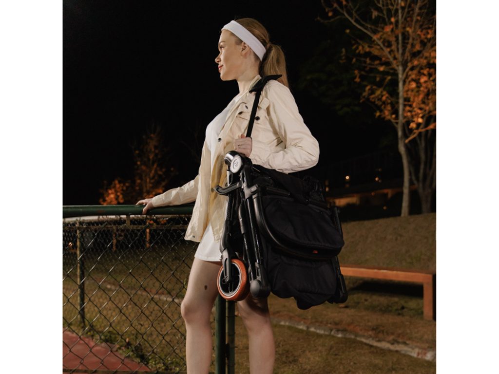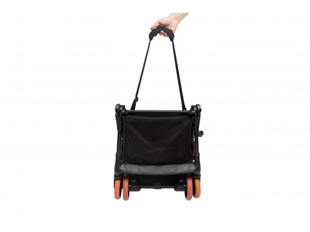 Maxi-Cosi Oslo Carbon se skládá do ultrakompaktního tvaru, po složení samostatně stojí a díky integrovanému popruhu přes rameno a madlu se pohodlně přenáší. Prostorný košík na zip udrží věci v bezpečí a přehledně uložené, takže nic nevypadne ani při manipulaci v letadle či vlaku.