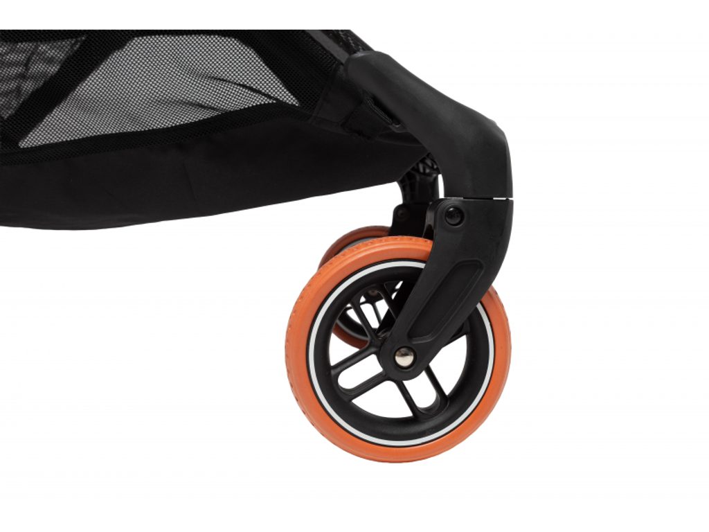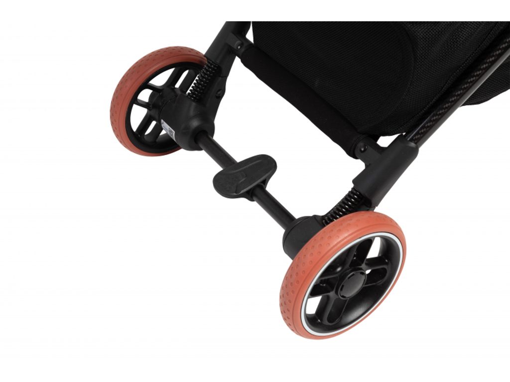 Kočárek je vybaven odpružením všech 4 kol, které se postará o stabilní a pohodlnou jízdu na městských chodnících i při cestování. Odolná kola zvládnou každodenní používání a časté skládání.