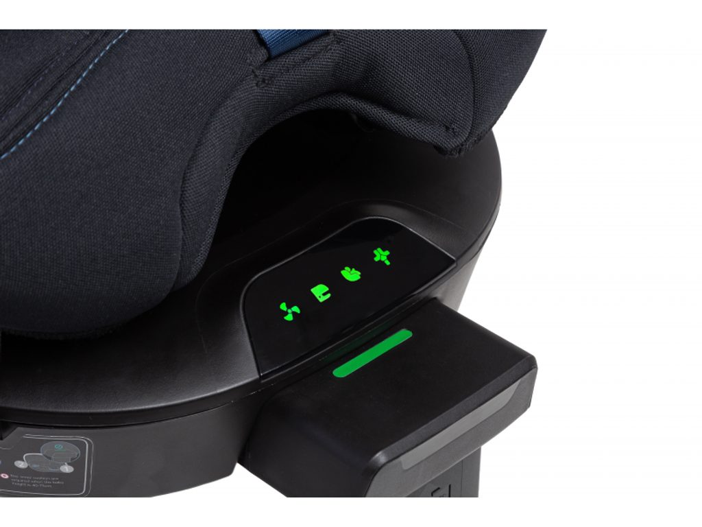 - Digitální indikátor instalace ukazuje správné zacvaknutí Isofixu, nastavení nohy i zajištění otáčení.