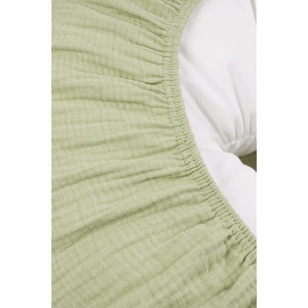 Potah je vyrobený z měkké 100% bavlněné mušelínové látky, která je předem vypraná, takže je okamžitě příjemná na citlivou pokožku novorozence. Mušelín je přirozeně prodyšný a lehký – žádné přehřívání, žádné dráždění. Jednoduchá gumička na spodku umožňuje rychlé a pevné obepnutí kolem polštáře bez zbytečného složitého upínání.