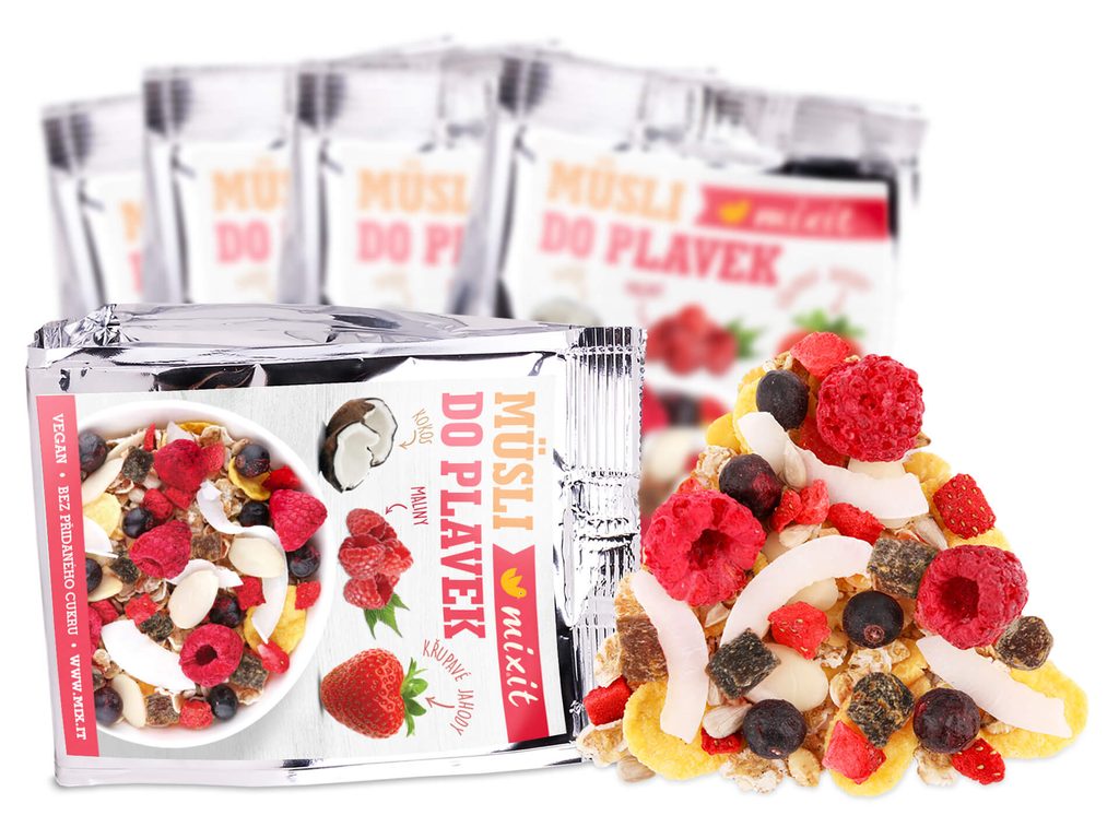 Nejoblíběnější ovocné müsli bez přidaného cukru a bez laktózy je nově v praktickém pytlíku. 5 porcí připravených na snídani, rychlou svačinu nebo doplnění energie po tréninku. Dostat Vás zpět do loňských plavek podle glykemického indexu potravin je jednoduché, zvlášť se směsí sestavenou naší výživovou poradkyní Janou Vašákovou. Tak snad Vám nebudou padat!Složení:ječné vločky 15,5 %, kukuřičné lupínky 14,5 % (kukuřičná mouka 87 %, ječmenný sladový extrakt, jedlá sůl), ovesné lupínky 14,5 %, pšeničné lupínky 14 %, sójové vločky 14 %, plátky mandlí 5,5 %, sušená meruňka 5,5 % (meruňka 97 %, rýžová mouka 3 %), kokosové plátky 5,2 %, slunečnicová semena 5 %, pufované amarantové perličky 2 %, lyofilizovaný černý rybíz 1,6 %, lyofilizované jahody 1,4 %, lyofilizované maliny 1,3 %Může obsahovat stopy mléka, jiných skořápkových plodů, arašídů a sezamu. Může obsahovat části skořápek.Energetická hodnota1647.0 kJ393.0 kcalTuky14.0 gz toho nasycené mastné kyseliny4.2 gSacharidy51.0 gz toho cukry6.8 gVláknina13.0 gBílkoviny15.0 gSůl0.3 g