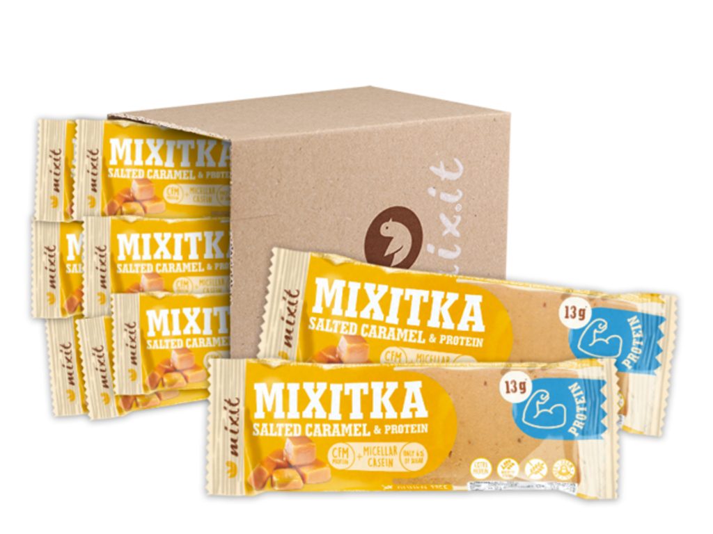 Je tu Mixitka nabušená proteiny a chutí slaného karamelu. Bezlepkovou recepturu jsme vyvíjeli pro všechny, kteří hledají pořádnou porci bílkovin (15 g bílkovin v každé tyčince) Proteinová složka obsahuje kvalitní syrovátkový proteinový koncentrát zpracovaný metodou CFM a micelární kasien, který proteiny do těla uvolňuje pomaleji a zasytí na delší dobu. Chuť slaného karamelu božsky doplňují nasekaná jádra mandlí, arašídové máslo a kokosový cukr. Každá Mixitka vám navíc dodá vysokou porci vlákniny pro zdravé zažívání. Skvělé na svačinu, po sportu a do každého pracovního i výletního batohu. :-) Složení:Rozpustná kukuřičná vláknina, micelární kasein 18,7 %, karamelový prášek (odstředěné mléko, syrovátka, cukr, máslo), CFM syrovátkový proteinový koncentrát 12,1 %, jádra mandlí, rozpustná čekanková vláknina (inulin), arašídové máslo, přepuštěné máslo, kokosový cukr, glycerol, himálajská sůlMůže obsahovat stopy lepku, jiných skořápkových plodů a sóji.Energetická hodnota1390.0 kJ332.0 kcalTuky13.0 gz toho nasycené mastné kyseliny5.3 gSacharidy39.0 gz toho cukry14.0 gVláknina22.0 gBílkoviny30.0 gSůl0.79 g