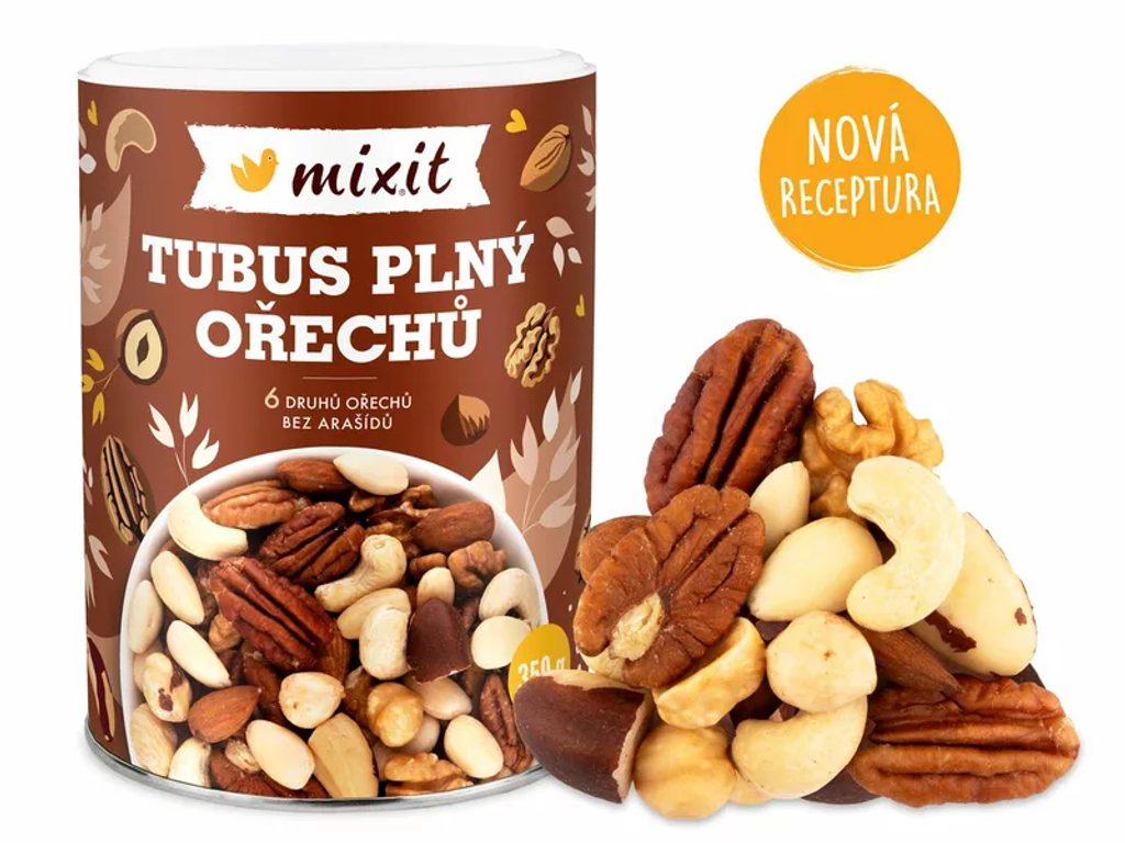 Nová receptura bez arašídů. 6 druhů ořechů. Milujete oříšky bez příkras a čokolády? Pro Mixit to nebyl žádný oříšek - vylouskali jsme pro vás 6 těch nejoblíbenějších! V jednom tubusu najdete jádra mandlí, jádra pražených lískových ořechů, jádra kešu ořechů, jádra para ořechů, jádra pekanových ořechů a jádra vlašských ořechů.