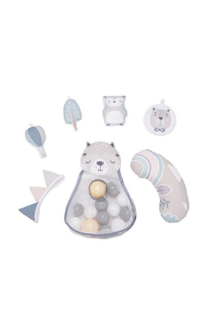 - Součástí je 5 univerzálních hraček k zavěšení, například šustící věnec a zrcátko, které lze použít jako samostatné hračky