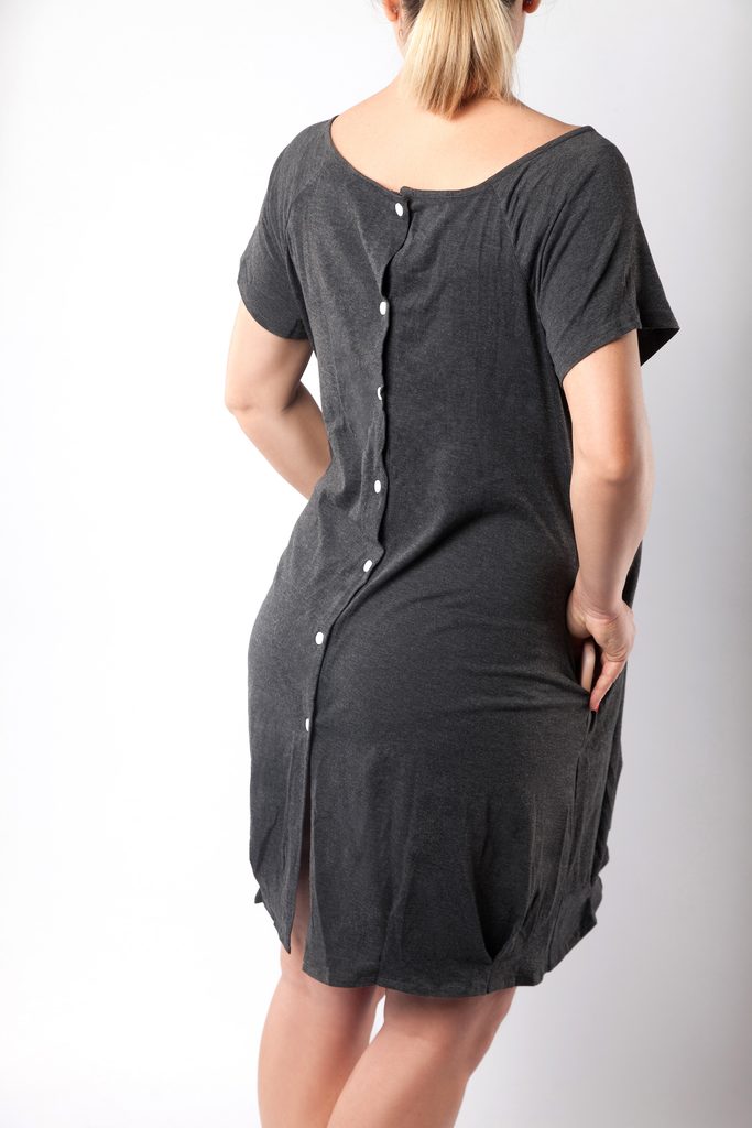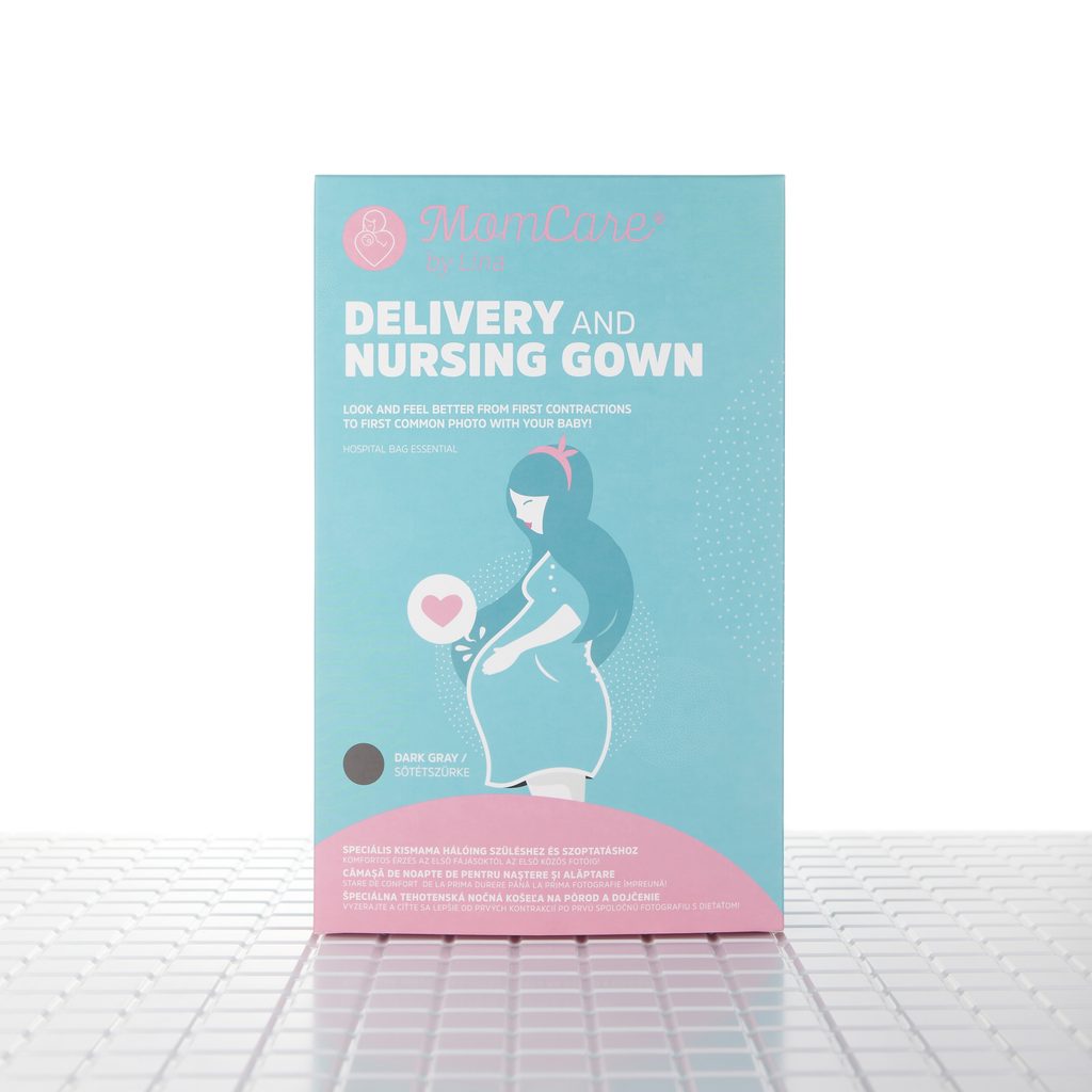 Přední otvor pro kontakt kůže na kůži nebo kojení, zapínání na knoflíky na zádech umožňuje snadný přístup k epidurální anestezii nebo fetálním monitorům. Krátké rukávy pro medikaci, měkký a elastický materiál (65 % bavlna a 35 % polyester), boční kapsy, 2 velikosti EU (S-M a L-XL), tmavě šedá barva, základ do nemocniční tašky.