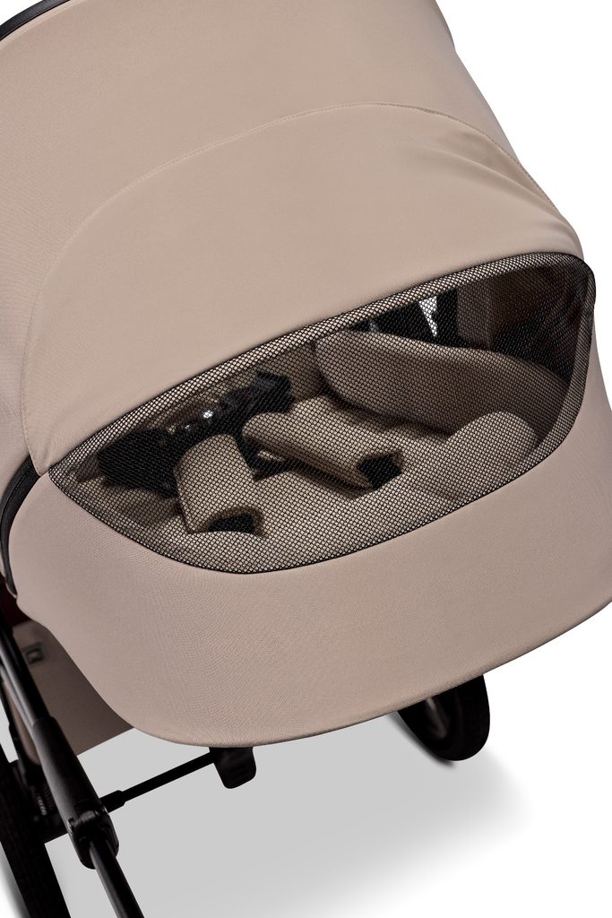 - Velké panoramatické okno a ventilační okénko – umožní miminku pozorovat svět a zároveň zajistí příjemné proudění vzduchu, což oceníte zejména v létě.