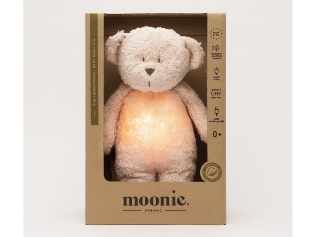 Moonie usínáček ve tvaru roztomilého medvídka s nočním světlem a relaxačními zvuky pomáhá miminku snadno se uklidnit a usnout. Uklidňující zvuky, které napodobují prostředí v děloze, zahrnují tlukot srdce, vítr, lesní potok, mořské vlny a déšť. Kromě toho nabízí kalimbovou ukolébavku, dvě klasické ukolébavky a možnost nahrát vlastní hlas.