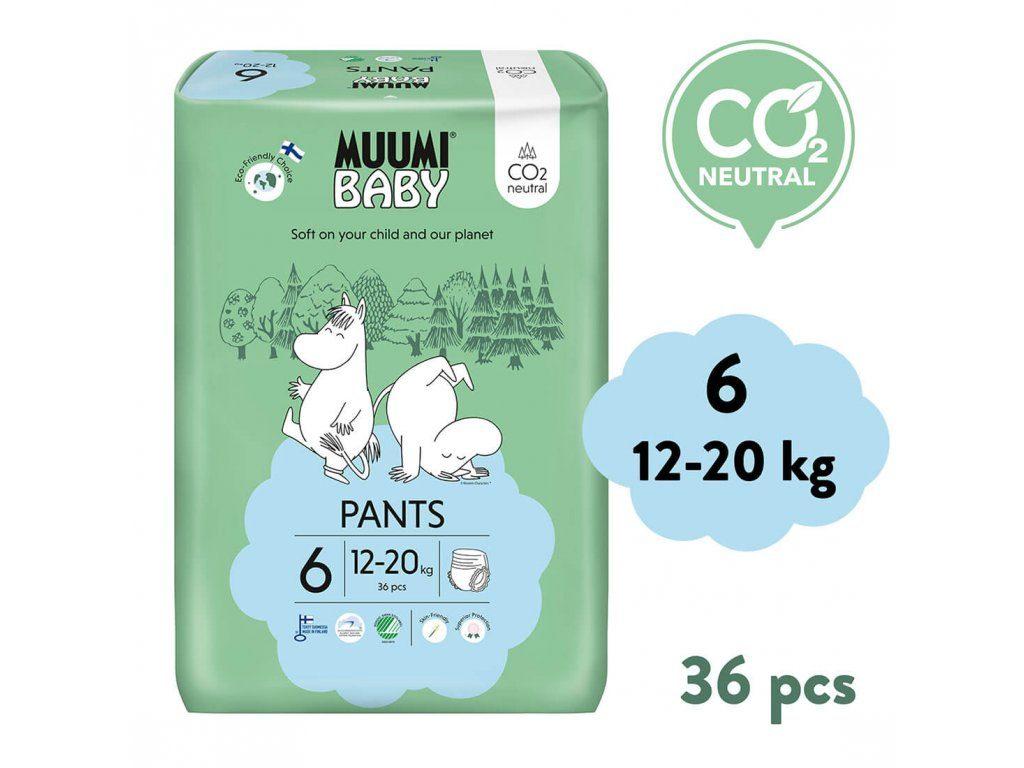 Muumi Baby Pants 6 Junior 12-20 kg (108 ks), měsíční balení kalhotkových eko plen + koš ZDARMA