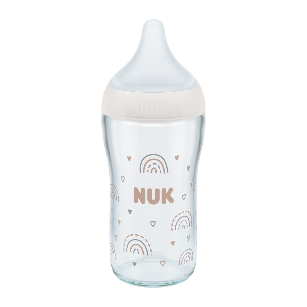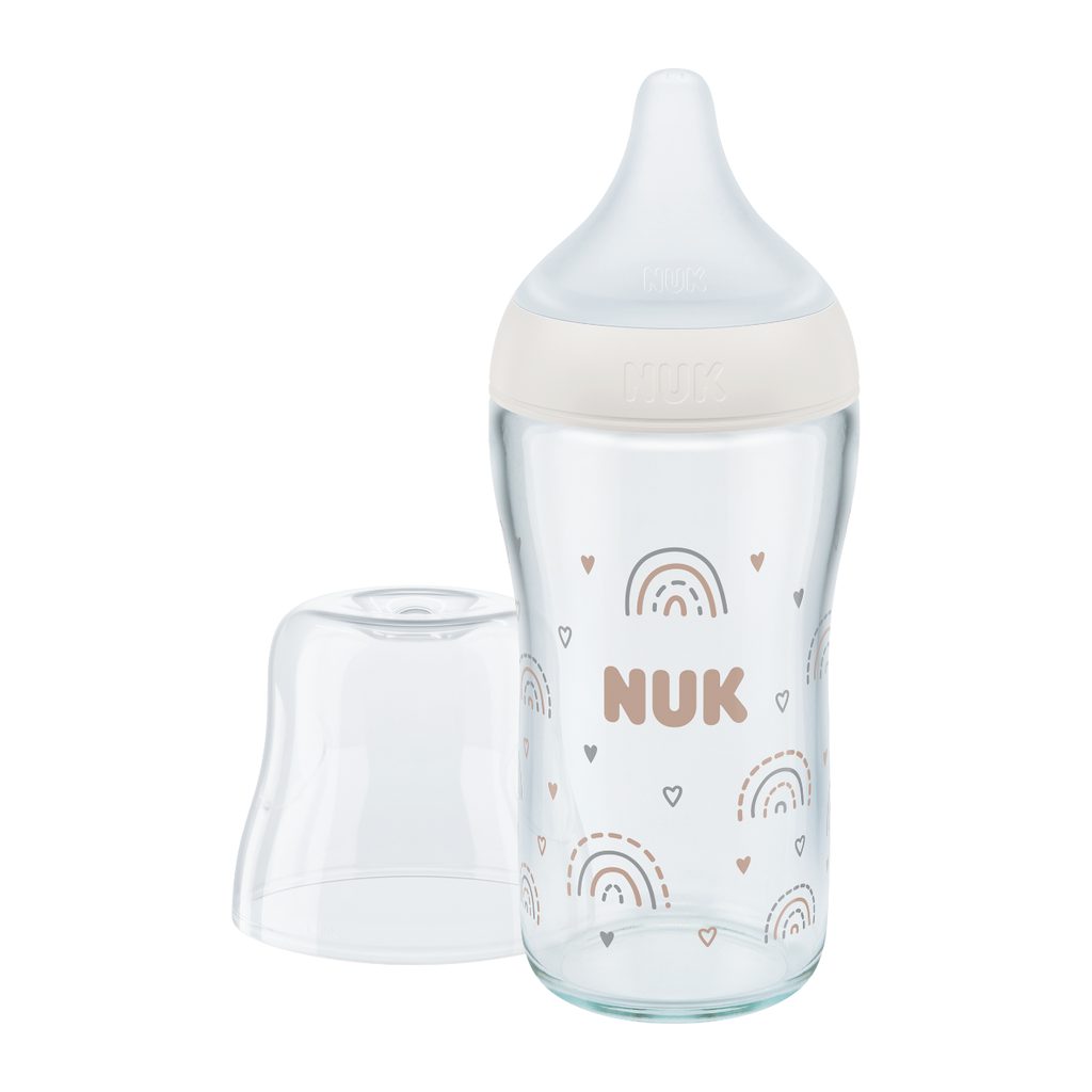 Skleněná kojenecká láhev NUK Perfect Match, s měkkou silikonovou savičkou,