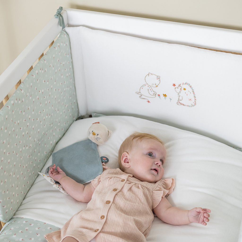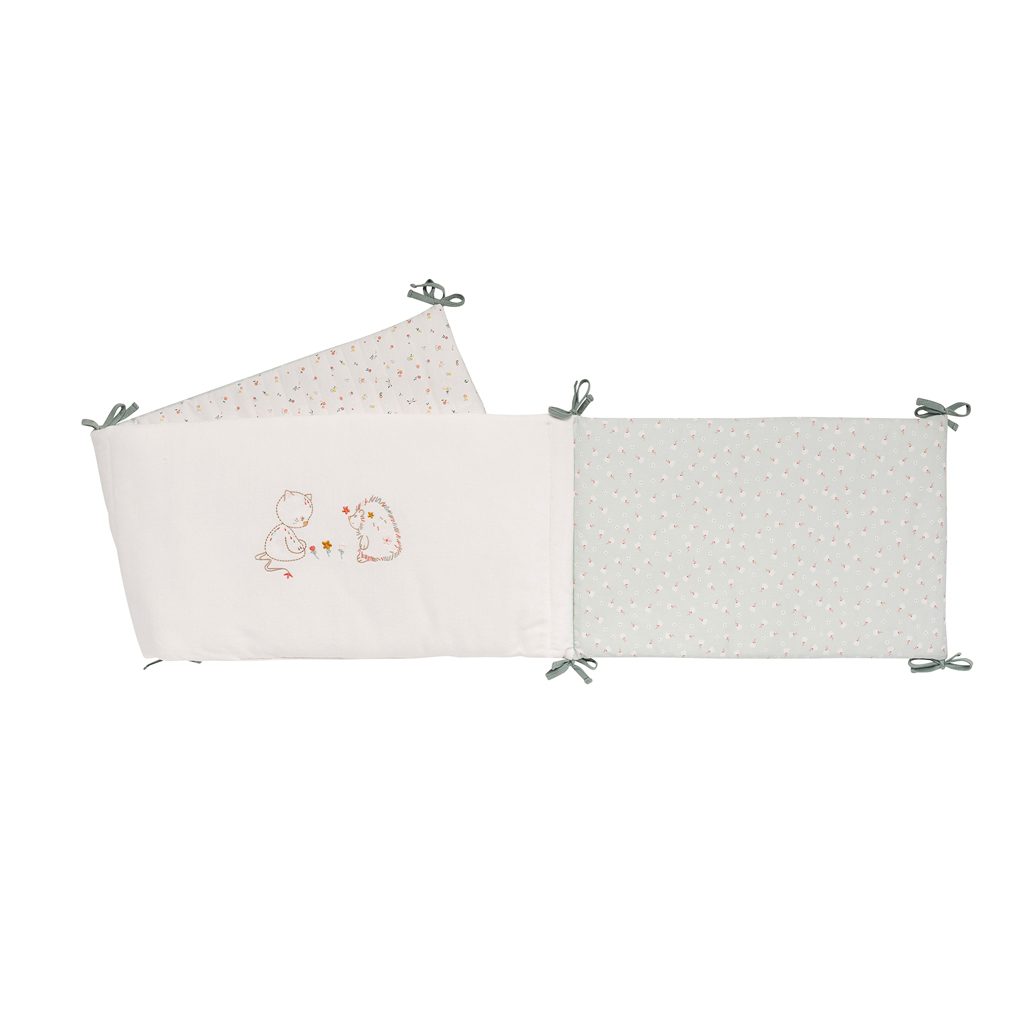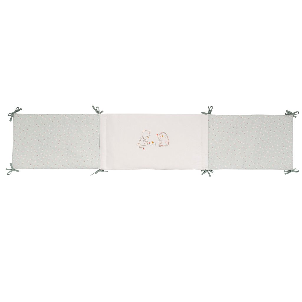 Ochranný mantinel do postýlky s krásnými aplikacemi chrání dítě před nárazy do tvrdých bočnic postýlky a vytváří bezpečné a útulné prostředí pro spánek. Díky šňůrkám je snadné jej připevnit k postýlce.