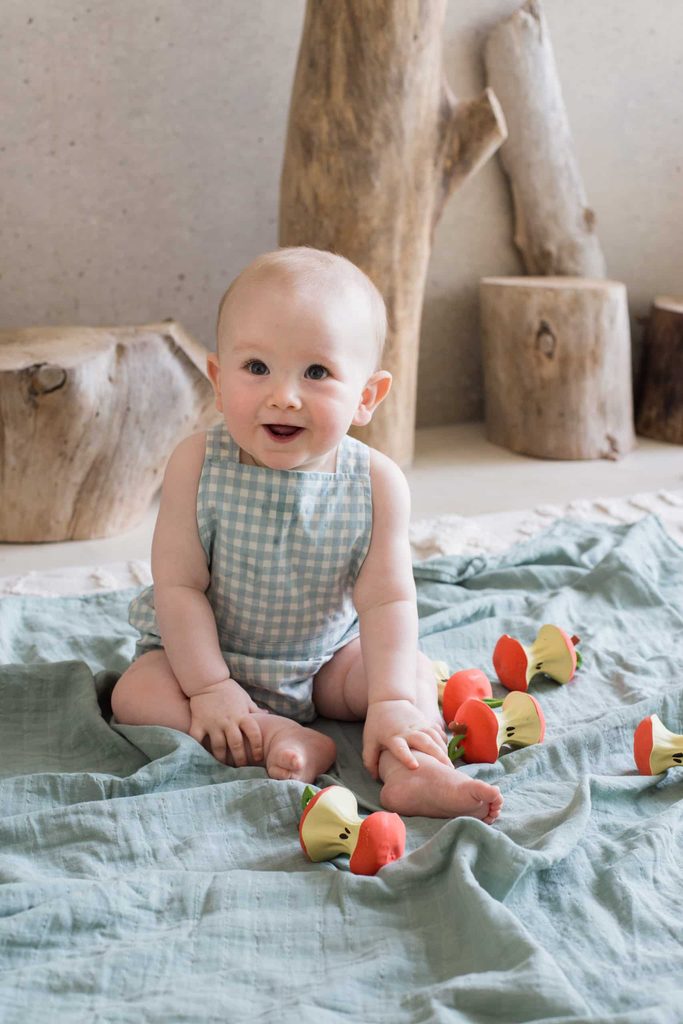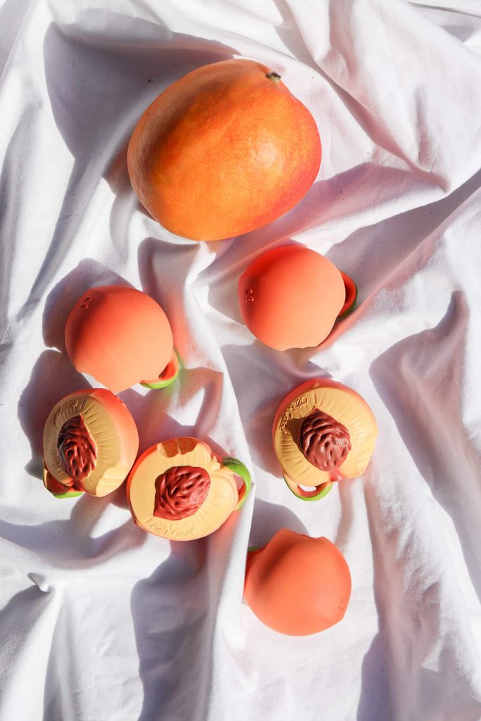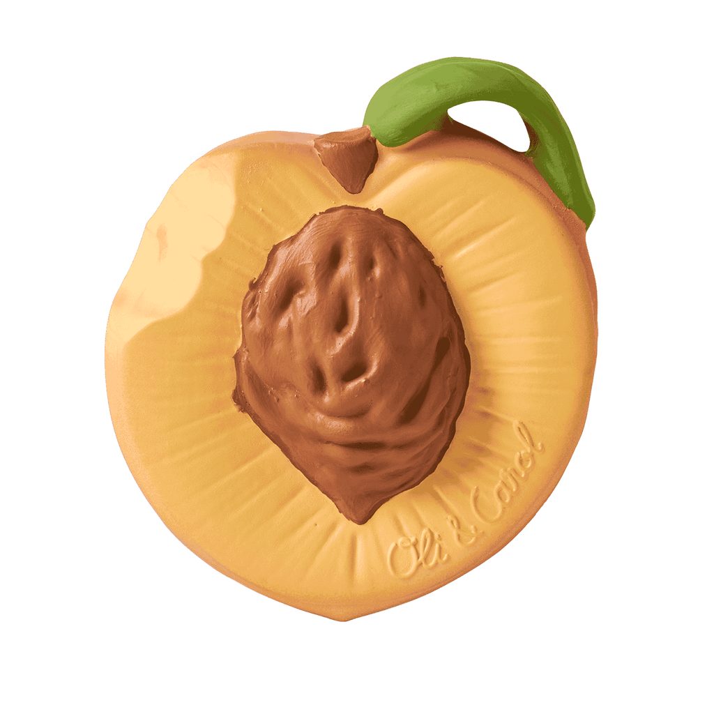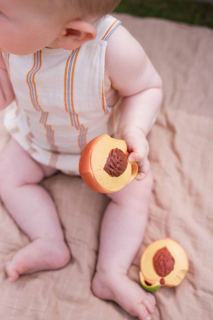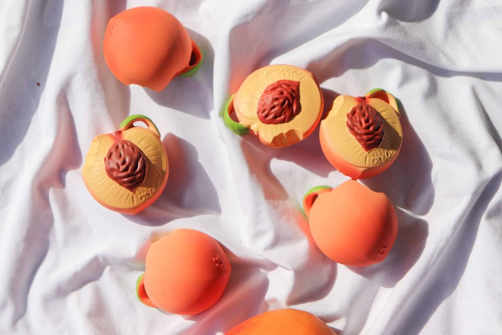 <strong>Senzorická eko-hračka, vyrobená z kaučuku,</strong> v tvare broskyne, vhodná na žuvanie a posilnenie ďasien či ako hračka do vody.
