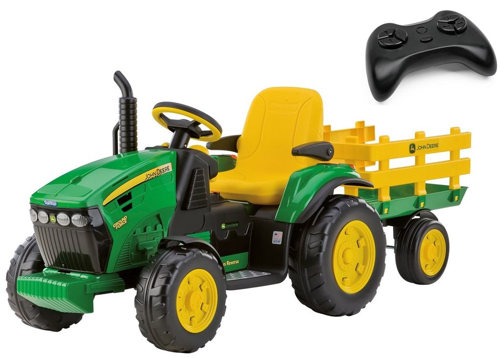 John Deere RC Tractor italské firmy Peg Pérego je vyráběn v licenci nejslavnějšího amerického traktoru na světě John Deere. Je jeho přesnou kopií a děti budou zbožňovat jeho sílu, jeho nezaměnitelné zelené a žluté barvy a jeho jedinečné vlastnosti. Peg Pérego - traktor s přívěsem a s dálkovým ovládáním je určen pro děti od 1 do 3 let. Od 3 let již může dítě řídit samostatně. Díky zpátečce se mladí řidiči učí manévrovat s vozidlem již v mladém věku. Sedadlo s bezpečnostním pásem a se dvěma pohyblivými loketními opěrkami lze nastavit do dvou poloh, takže vzdálenost od pedálu a volantu lze přizpůsobit velikosti dítěte. Robustní běhouny kol zajišťují optimální trakci na pevném i nerovném terénu a umožňují stoupání až do 10%.