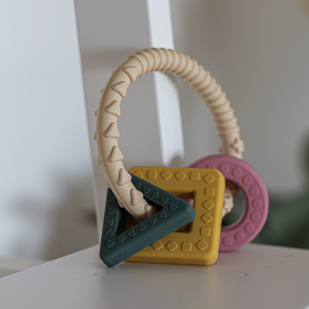 Silikonové kousátko FIGURES, které se skládá z kroužku s výstupky, na nichž jsou geometrické tvary, umožňuje dítěti objevovat svět nových pocitů.