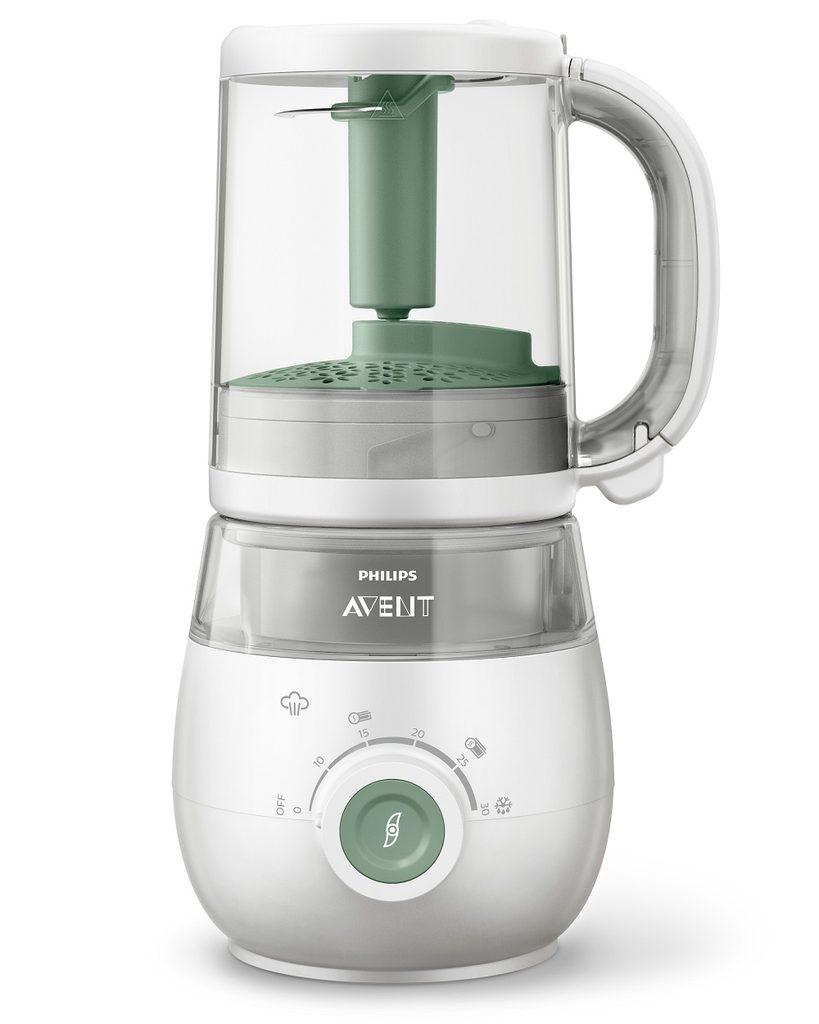 AVENT Parní hrnec a mixér 4v1 pro přípravu zdravé dětské stravy. Jednoduchá výživná jídla pro děti - stačí otočit nádobu - **vařte v páře, mixujte, rozmrazujte a ohřívejte** - jedinečné provedení 4 v 1. **Více jídel najednou** - uvařte až 4 jídla naráz s 1 000 ml nádobou. Jedinečná technologie páry - **vaření v páře** představuje zdravý způsob přípravy potravin. Unikátní technologie umožňuje páře proudit zespodu nahoru, čímž je zajištěna rovnoměrná tepelná úprava ingrediencí bez vaření. Vařte v páře, míchejte a mixujte - **vše potřebné k přípravě výživné dětské stravy v jediné nádobě**. Až budou ingredience podušené, stačí jen odklopit víko nádoby, otočit ho a upevnit v obrácené poloze. Poté už vše jen rozmixujte na požadovanou konzistenci. **Strava pro jakoukoli fázi odstavení** - tento přístroj 4 v 1 pro přípravu zdravé dětské stravy **zvládá každý krok procesu mixování od velmi jemně rozmixovaného ovoce a zeleniny, přes míchání přísad, po vytvoření směsi s malými kousky**. **Snadné čistění** - nádobu a ostří lze mýt v myčce na nádobí a nádržka na vodu je snadno přístupná. **Chutné a výživné recepty** - chutné recepty pro přechod na tuhou stravu od Dr. Emmy Williamsové. Stáhněte a objevte víc - objevte zdravé recepty, zábavná videa a tipy a triky.