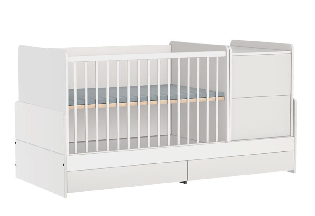Luxusní trasformovatelná postýlka 5 v jednom za skvělou cenu. Vysoká kvalita použitých materiálů, lakování ve vysokém lesku i nejkvalitnější kování s tlakovým ovládáním a tlumením stanoví nová měřítka prostorově úsporného řešení. Na 2 metrech máte celý dětský pokoj. Na počátku ji budete využívat v kompletu a všechno máte při ruce. Později, když dítě povyroste, z kompletu vytvoříte samostatnou postýlku a skříňku. Ve třetí fázi postel 180x80 cm a psací stůl. Nároky dítěte i Vaše se časem mění. Tato kombi postýlka s nimi bude držet krok.