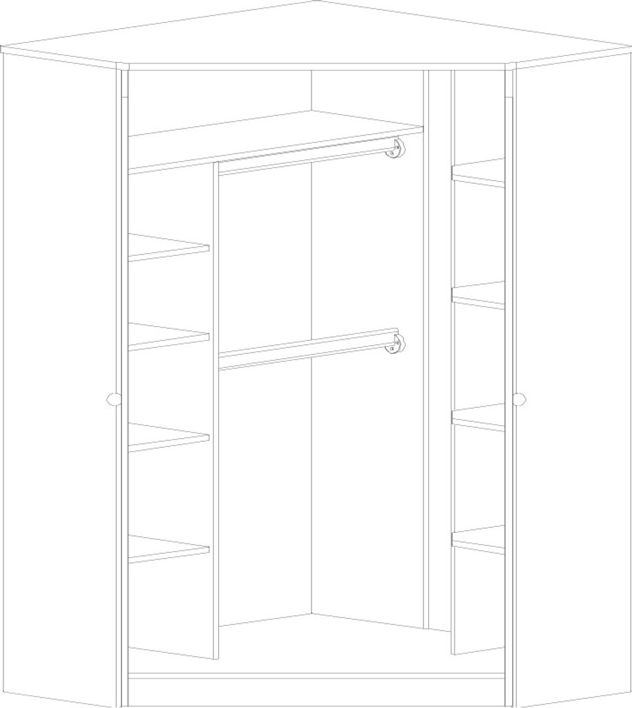 - Bohatě vybavena policemi, šatními tyčemi a zásuvkami podle schématu.