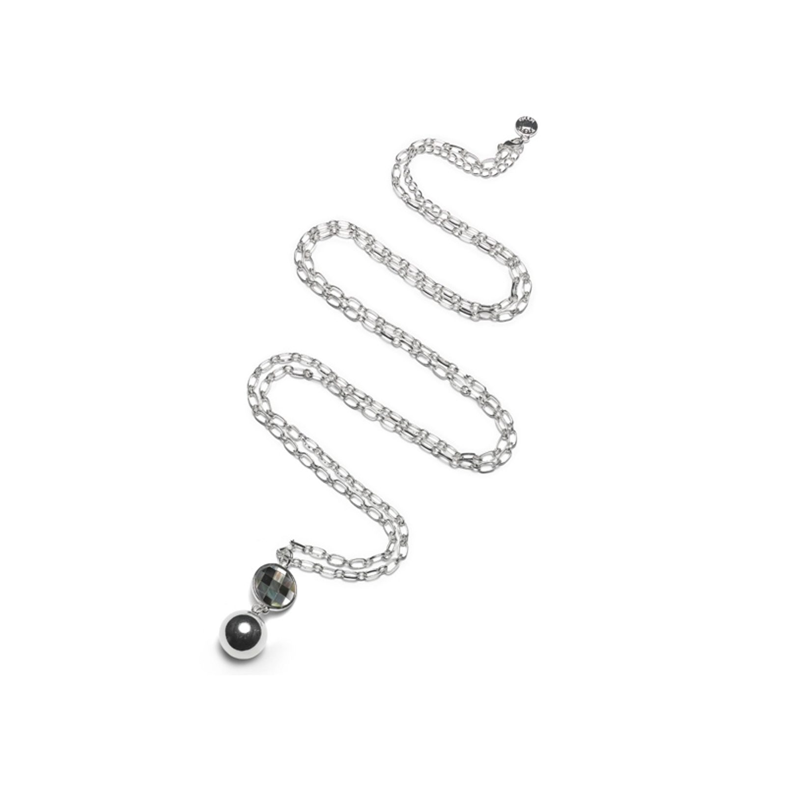 Barva šedá / stříbrná, materiál kov / perla, délka 120 cm + 10 cm prodloužení , váha 42 g.
