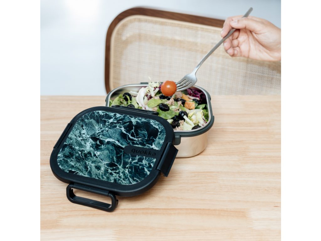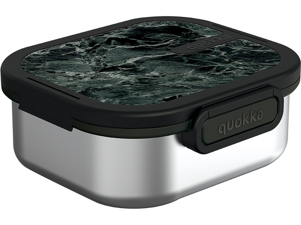 Box na jídlo Quokka Kai z vysoce kvalitní nerezové oceli s plastovým víkem je vhodný pro bezpečné přenášení svačiny či oběda do školy, do práce i na výlety. Spolehlivé, 100% těsnicí víko s klipovým zapínáním chrání obsah boxu před vylitím či vysypáním. Nerezový materiál neabsorbuje pachy a je tak vhodný pro jakékoli jídlo. Objem: 1 l Rozměry: 180 x 165 x 68,5  mm Složení: nerezová ocel, PP Neobsahuje BPA. Box není vhodný do myčky ani mikrovlnné trouby.