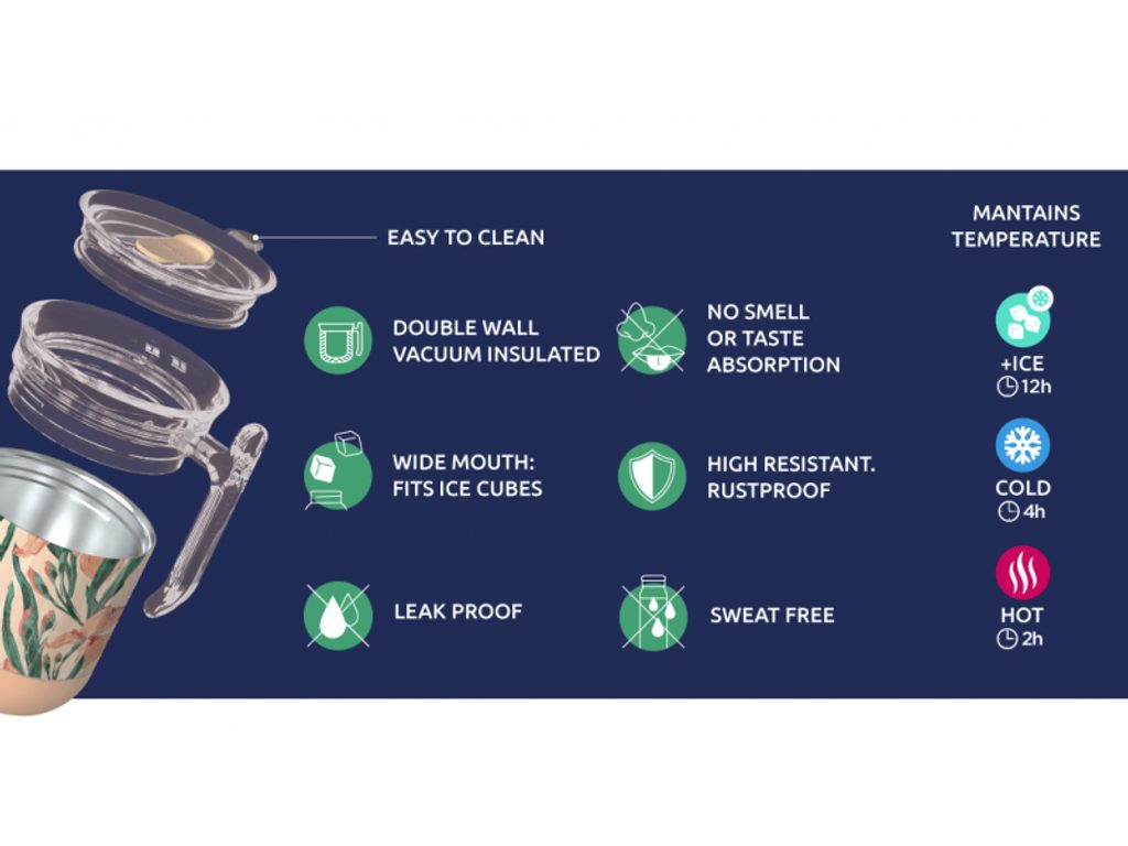 Praktický termohrnek Quokka Wave je vyroben z vysoce kvalitní dvoustěnné nerezové oceli, která zajišťuje optimální udržení teploty nápoje. Díky pevnému 100% těsnícímu víčku nehrozí únik tekutiny ani při přenášení.