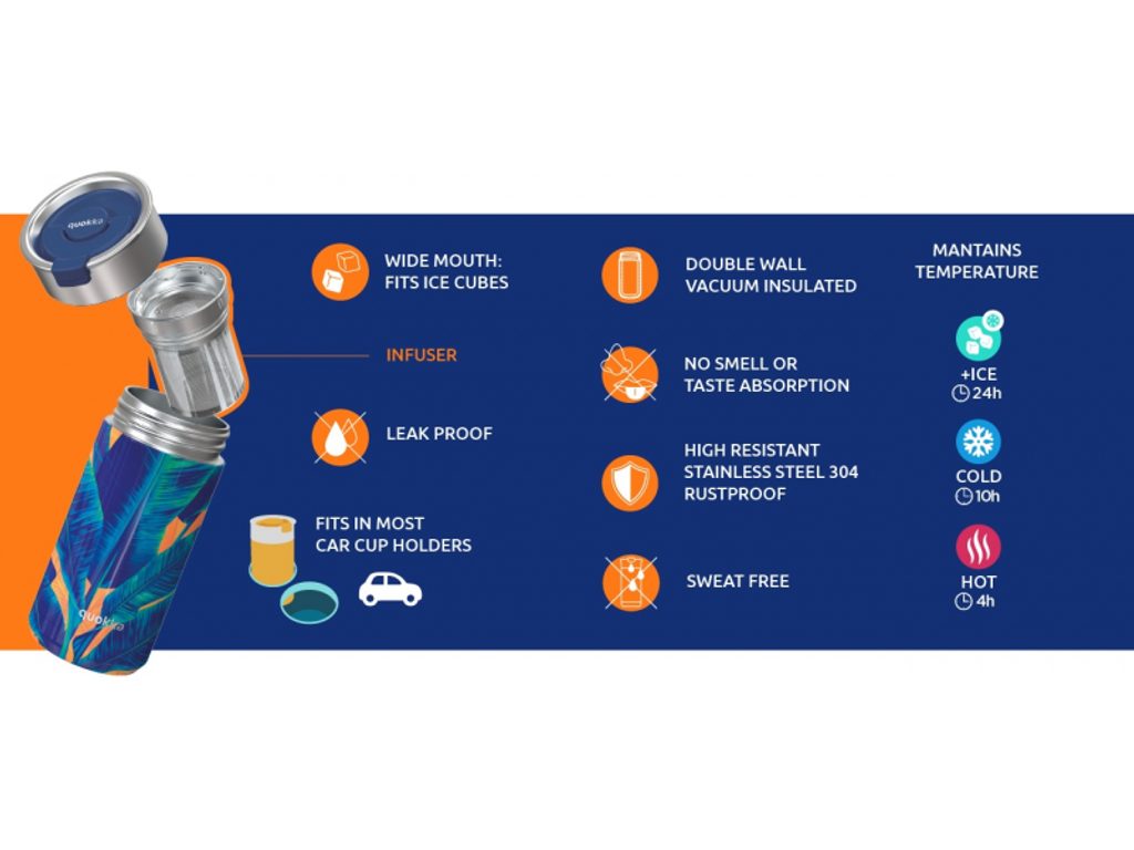 Termohrnek Quokka Boost z vysoce kvalitní dvoustěnné oceli se spolehlivým, 100% těsnicím uzávěrem udrží váš nápoj dle potřeby teplý či studený. Termohrnek udrží teplotu studeného nápoje s ledem až 24 hodin, studeného nápoje až 10 hodin a teplého nápoje až 4 hodiny. Součástí termohrnku je vyjímatelné sítko, vhodné např. na sypaný čaj. Široké hrdlo umožňuje vložení kostek ledu. Víčko se zaklapávacím uzávěrem umožňuje snadné pití přímo z hrnku. Objem: 400 ml Rozměry: 167 x 74 mm Nerezový materiál neabsorbuje pachy a neobsahuje BPA. Termohrnek není vhodný do myčky ani mikrovlnné trouby.