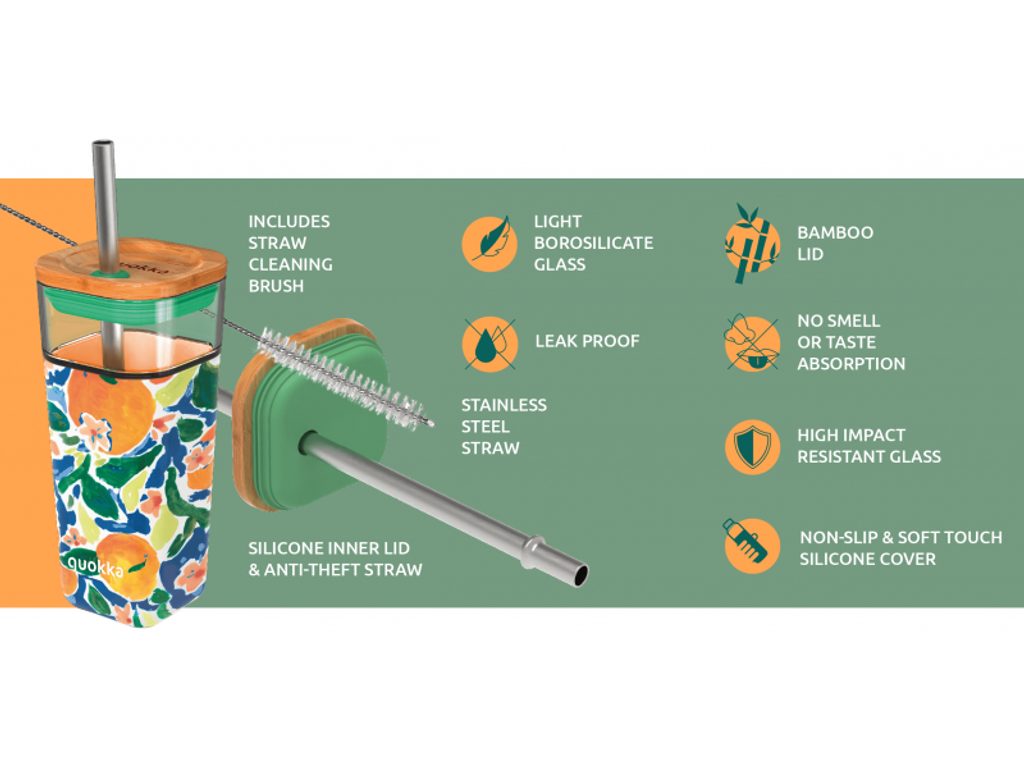 Skleněný cestovní hrnek Quokka Liquid Cube s kovovým brčkem je vybaven spolehlivým těsnicím víčkem z bambusu a silikonu. Protiskluzový silikonový návlek usnadňuje a zpříjemňuje držení hrnku.  Součástí balení je čisticí kartáček pro brčko. Objem: 540 ml Rozměry: 240 x 80 x 80 mm Hmotnost: 434 g Materiál: odolné borosilikátové sklo, bambus, silikon, nerezová ocel Neobsahuje BPA. Hrnek není vhodný do myčky ani mikrovlnné trouby.
