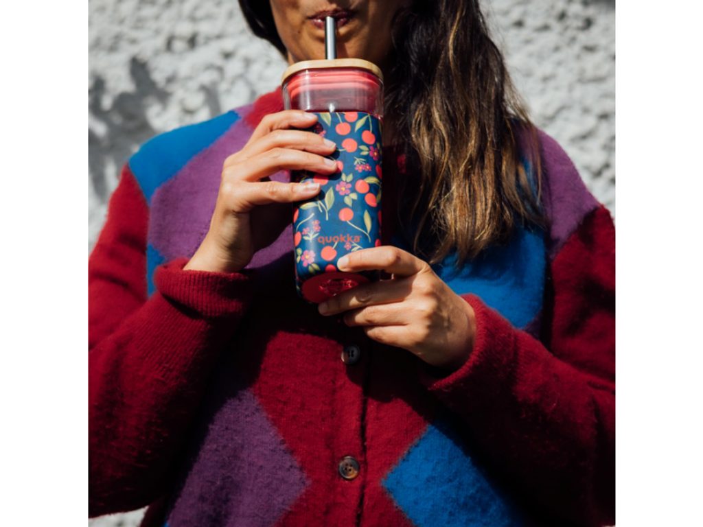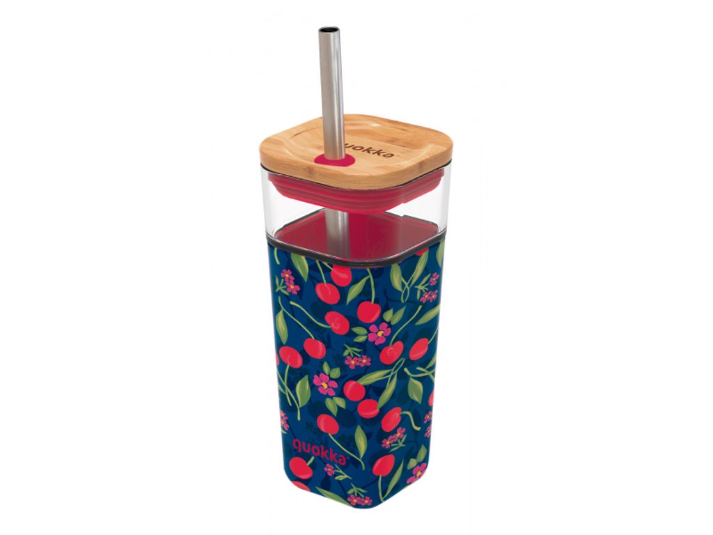 Quokka Skleněný cestovní hrnek s brčkem Liquid Cube Cherries 540 ml
