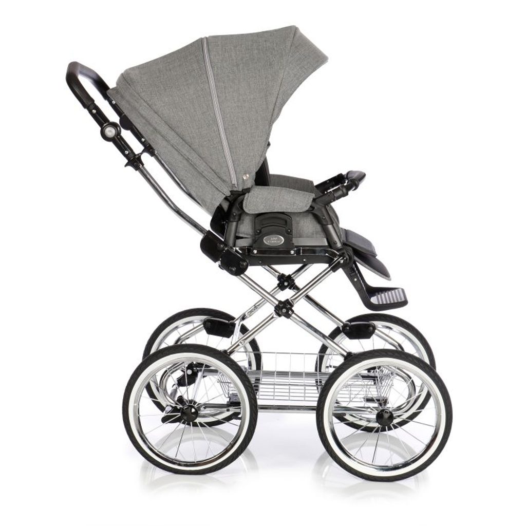 Základ tvoří chromovaná konstrukce s měkkým zavěšením, která zajišťuje plynulou jízdu i v nerovném terénu. Velká nafukovací kola perfektně tlumí nárazy a výškově nastavitelná rukojeť z eko kůže se přizpůsobí výšce každého rodiče díky kloubovému mechanismu. Praktický systém „Click" umožňuje snadnou výměnu jednotlivých nástaveb během několika vteřin. Prostorný drátěný košík pojme veškeré potřebné věci na procházku a centrální brzda zajišťuje bezpečné parkování.
