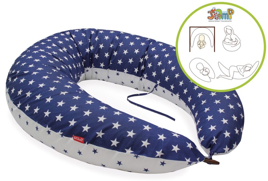 Kojící polštář XXL od společnosti Scamp nabízí více funkcí.Poskytuje účinnou pomoc během těhotenství, umožňuje těhotné matce zaujmout nejpohodlnější polohu:podporuje pas během spánku a odpočinku, zvedá stehna a podpírá břicho matky, zatímco leží na boku.Použití po narození dítěte:• Během kojení: poskytuje pohodlnou polohu pro dítě a matku.• Jako hnízdo může sloužit jako podpěra v poloze vleže nebo vsedě.• Na straně postýlky jako mantinel.Výrobek obsahuje dva zcela oddělené potahy: vnitřní a vnější potahy.Vnitřní potah z mikrovlákna, který je vyroben ze 100% polyesteru a umožňuje praní při vysokých teplotách (lze prát i s výplní).Výplň, kterou jsou polyesterové kuličky, lze zkontrolovat pomocí zipu, je antialergická a certifikována společností Ökotex.Polyesterová koule nabízí mnohem pevnější držení než polyesterové vlákno. Na rozdíl od běžných perlových kuliček jsou silikonizované polyesterové kuličky tiché.Vnější potah je vyroben ze 100% bavlny a má certifikát Ökotex.Na konci polštáře je knoflík s poutkem pro snadné spojení, uprostřed tkaničky pro svázání při kojení a pro odpočinek dítěte.Velikost:Vnější oblouk: 230-235 cm, který umožňuje osobě nad 160 cm pohodlně spát a odpočívat.Oba konce mají vzdálenost 130 až 150 cm, jeho průměr je 30-60 cm.