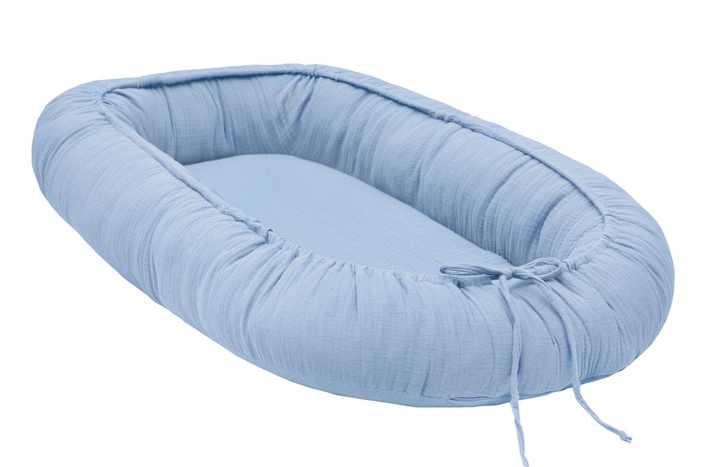 Mušelínové hnízdo pro miminko. Rozměr: 50×80 cm Lehací plocha: 28×60 cm   Materiál:Potah: 100% bavlna, mušelínVýplň: 100% silikonizované polyesterové kuličky Výrobek je… Zobrazit více