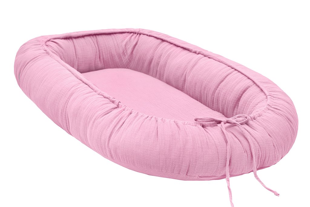 Mušelínové hnízdo pro miminko. Rozměr: 50×80 cm Lehací plocha: 28×60 cm   Materiál:Potah: 100% bavlna, mušelínVýplň: 100% silikonizované polyesterové kuličky Výrobek je… Zobrazit více