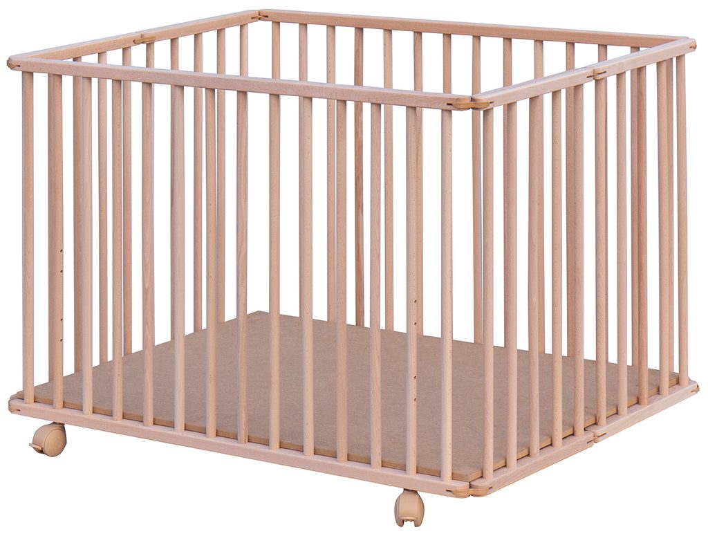 Dno je vyrobeno z MDF pro snazší údržbu. Kolečka jsou součástí ohrádky. Dno ohrádky je možné posunou do 3 různých poloh. Mechanizmus polohování je velmi jednoduchý. Ohrádku je možné v případě potřeby velmi jednoduše složit po vyjmutí dna.