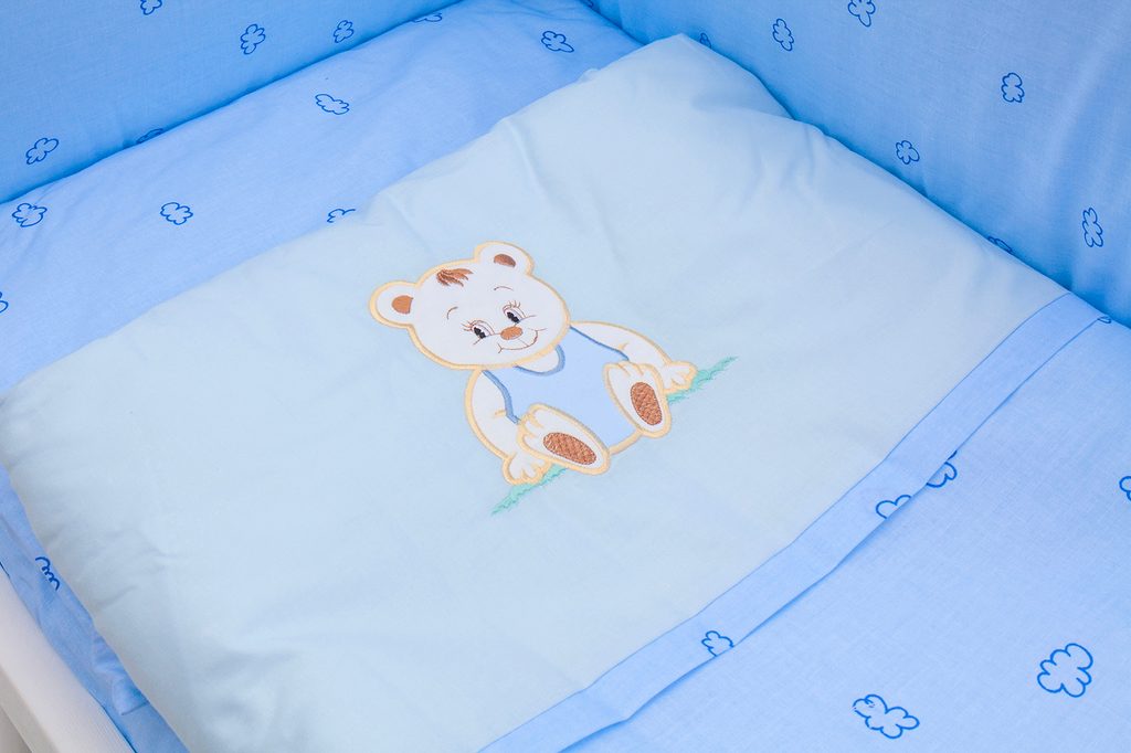 Scarlett Dětská postýlka Baby bílá s kompletní výbavou Méďa modrá 90x41 cm