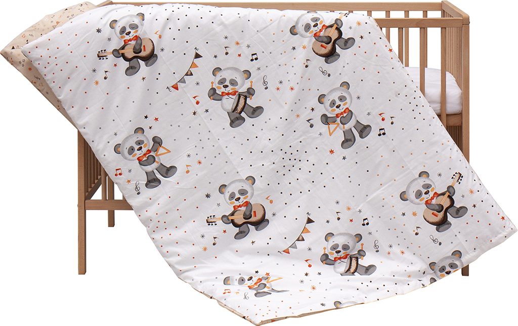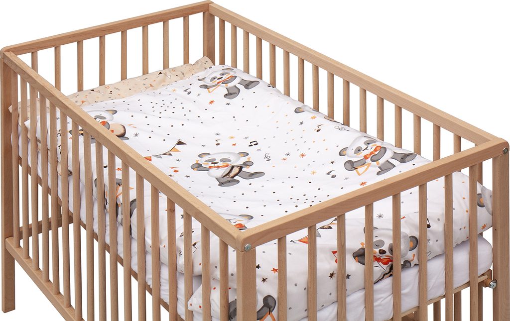 Matrace z PUR pěny (tloušťka 5,2 cm) s potahem z mikrofibry poskytuje rovnou, pevnou plochu pro zdravý spánek miminka – přesně tak, jak doporučují pediatři. Potahy peřinky a polštářku jsou z 100% bavlny, příjemné na dotek a snadno pratelné. Prostěradlo s rozměry 120 × 60 cm sedí na matraci přesně na míru.