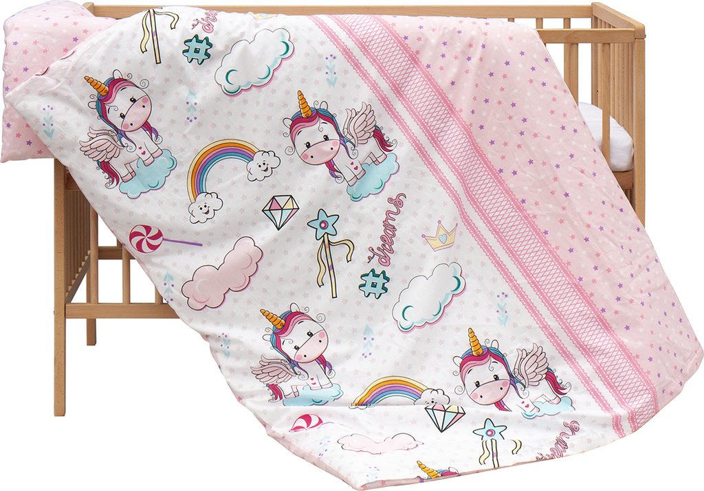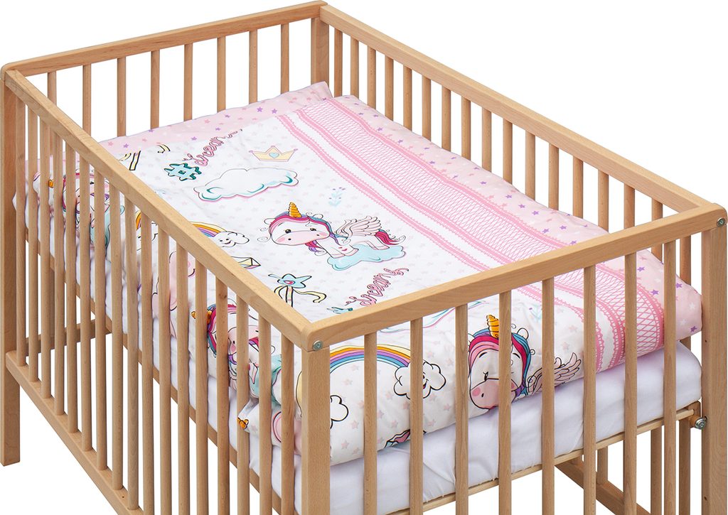 Matrace z PUR pěny (tloušťka 5,2 cm) s potahem z mikrofibry poskytuje rovnou, pevnou plochu pro zdravý spánek miminka – přesně tak, jak doporučují pediatři. Potahy peřinky a polštářku jsou z 100% bavlny, příjemné na dotek a snadno pratelné. Prostěradlo s rozměry 120 × 60 cm sedí na matraci přesně na míru.