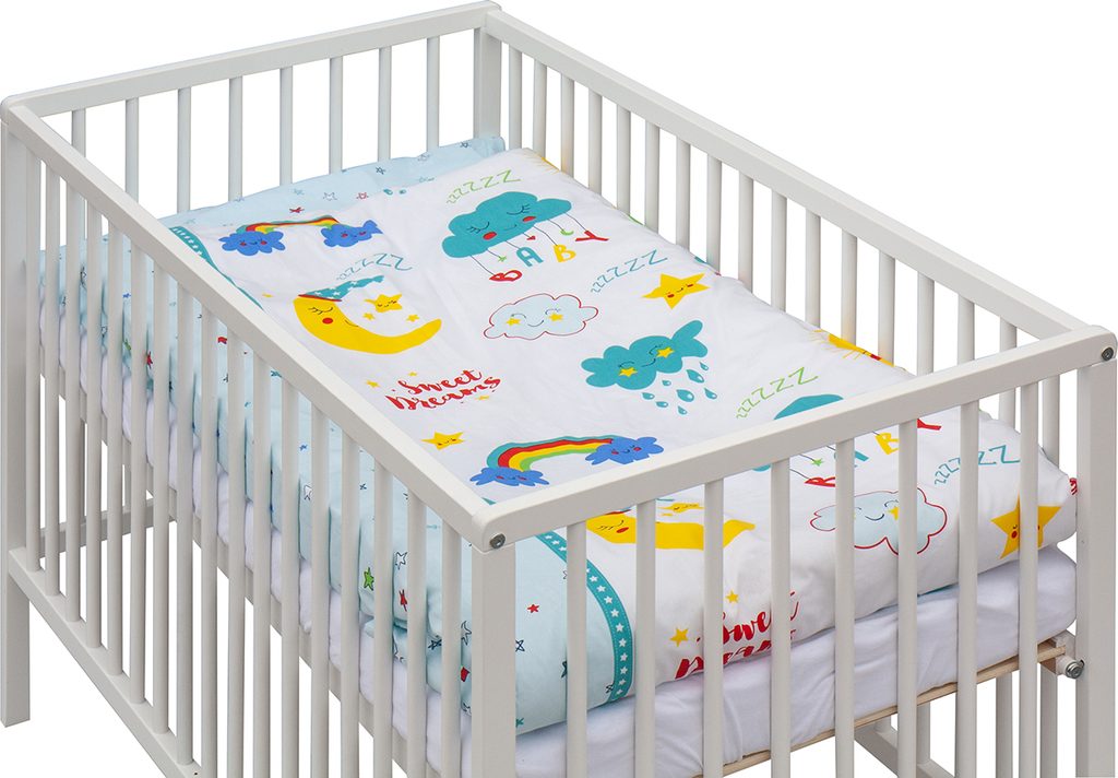 Jaké jsou rozměry postýlky a je kompatibilní s běžným povlečením? Ložná plocha je 120 × 60 cm – standardní rozměr, pro který je dostupné běžné dětské povlečení v každém obchodě. Prostěradlo i matrace jsou přímo součástí setu.