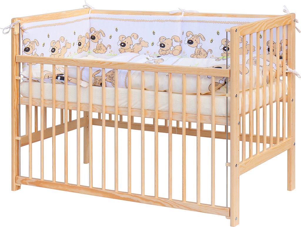 - Dřevěná dětská postýlka 120 x 60 cm - vyrobena z přírodní masivní borovice, se stahovacím bokem a 6 nastavitelnými polohami roštu.