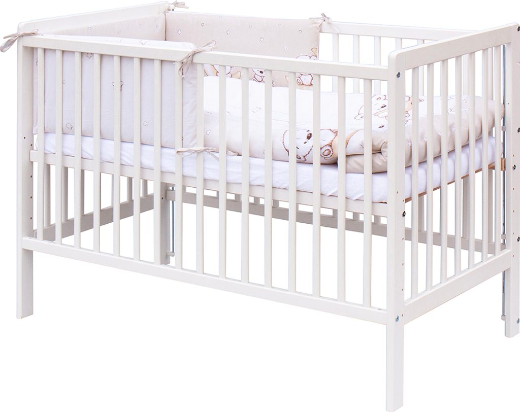 - Dřevěná postýlka 120 x 60 cm v bílé barvě, vyrobená z masivní borovice. Má 3 vyndavací příčky, 6 nastavitelných poloh roštu, a nohy jsou předvrtány pro případné připevnění koleček.
