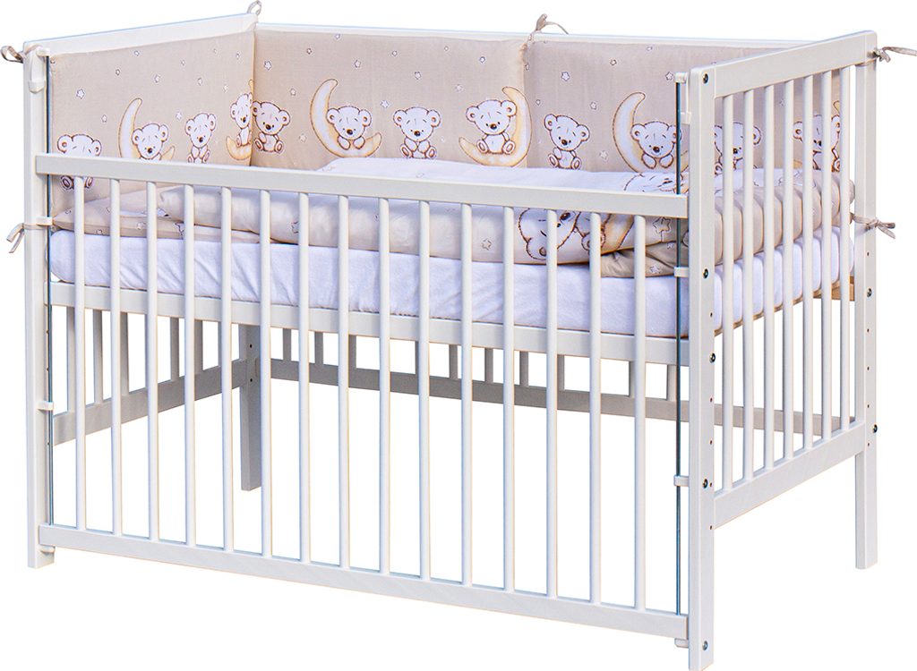 - Dřevěná postýlka (120 x 60 cm) – bílá, vyrobená z masivního buku, s funkcí stahovacího boku a 6 polohami roštu pro růst vašeho dítěte.