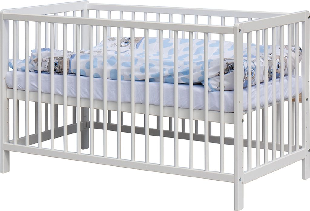 1. Dětská dřevěná postýlka 120x60 cm - bílá, masiv borovice, 3 vyndavací příčky, 5 poloh roštu