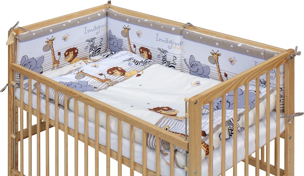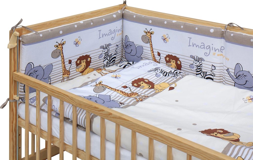 Bavlněné povlečení a mantinel jsou šité pro nejcitlivější dětskou pokožku – hypoalergenní, prodyšné a snadno pratelné v pračce. Mantinel 180×30 cm chrání miminko před nárazem do mřížek a tlumí průvan.